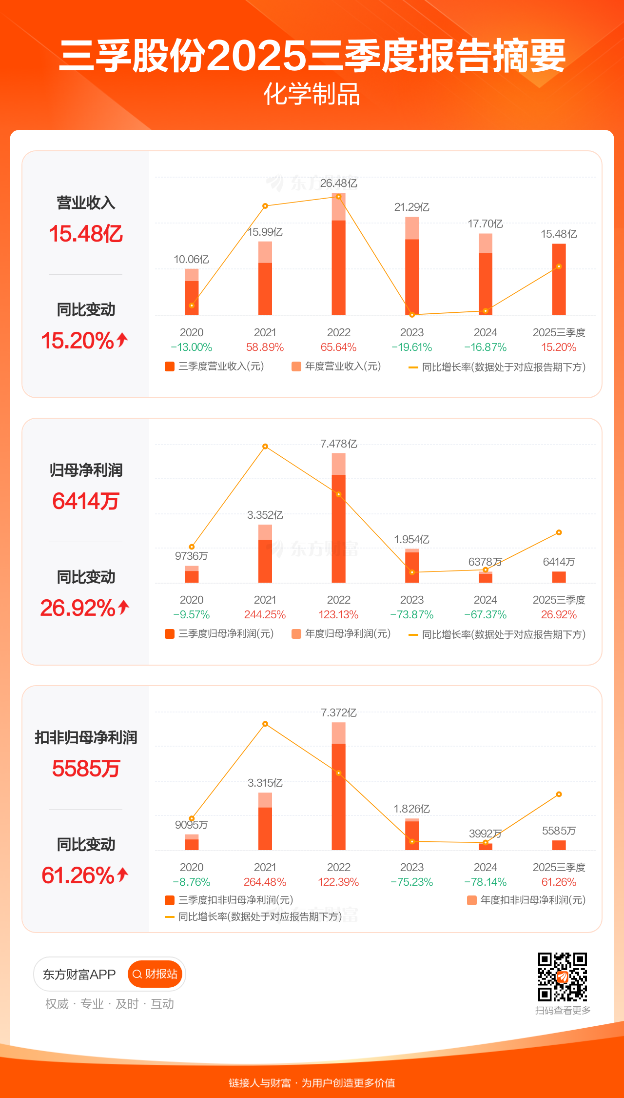 三孚股份10月24日发布2025年三季报显示,公司前三季实现营业收入15.48亿元,同比增长15.20%;归母净利润6413.56万元,同比增长26.92%;扣非归母净利润5585.39万元,同比增长61.26%。每股EPS0.17元,低于机构一致预测的0.22元。