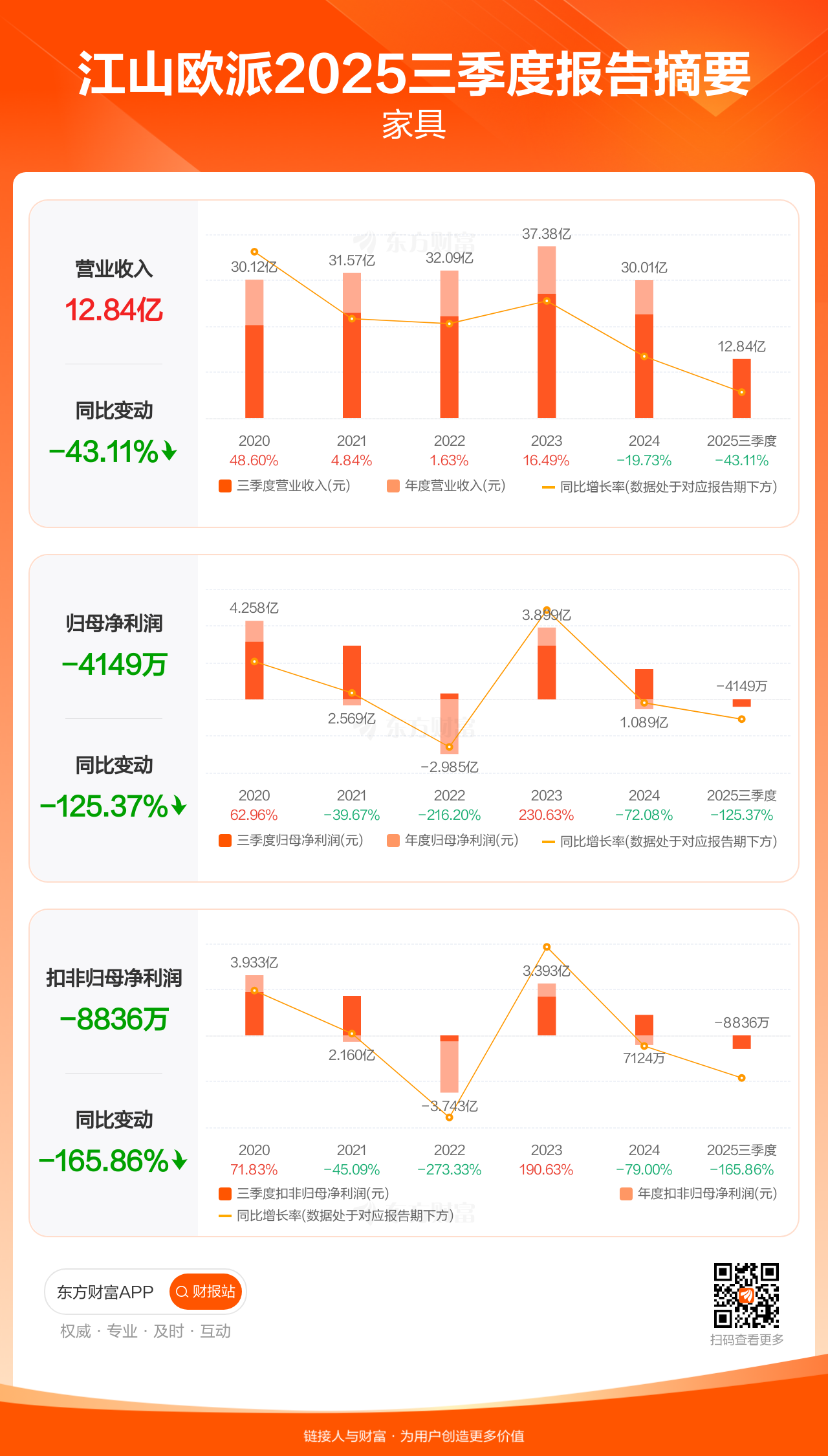 江山欧派10月24日发布2025年三季报显示,公司前三季实现营业收入12.84亿元,同比下滑43.11%;归母净利润-4149.20万元;扣非归母净利润-8835.65万元。每股EPS-0.24元,低于机构一致预测的0.48元。