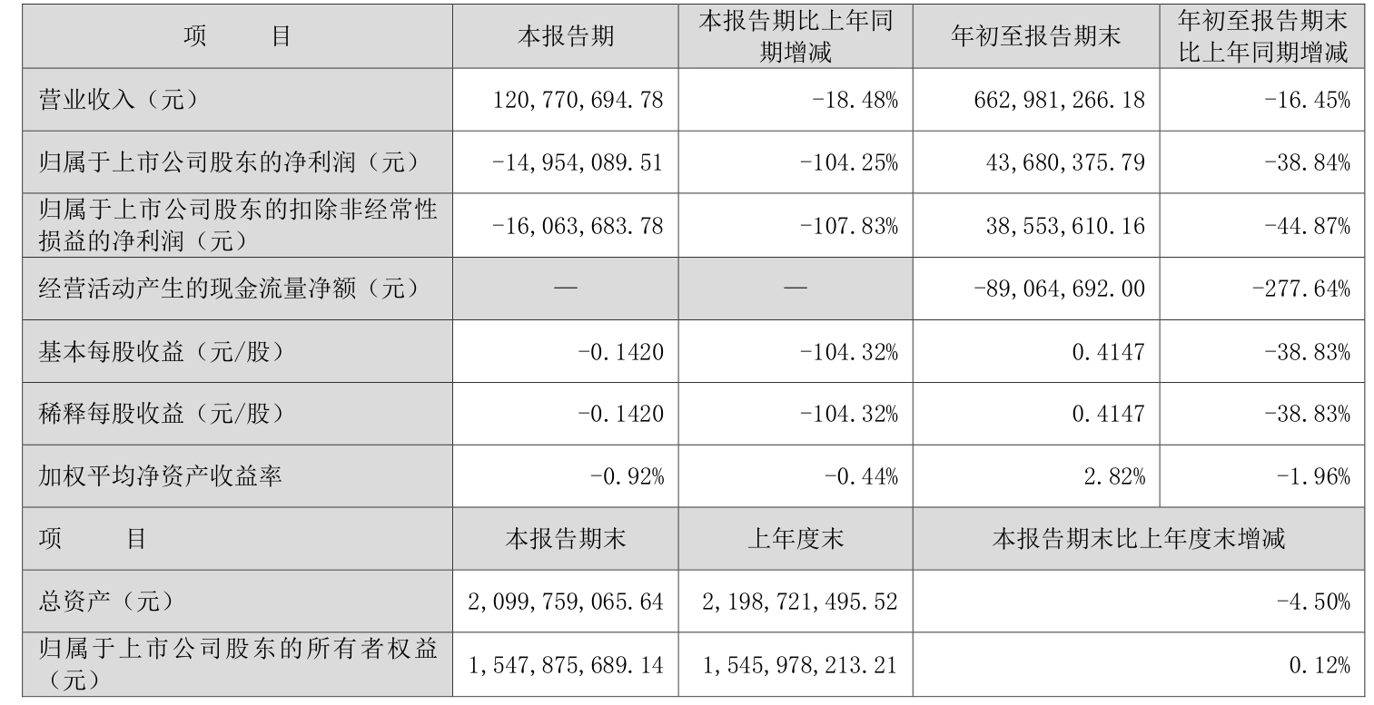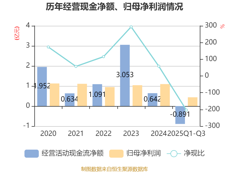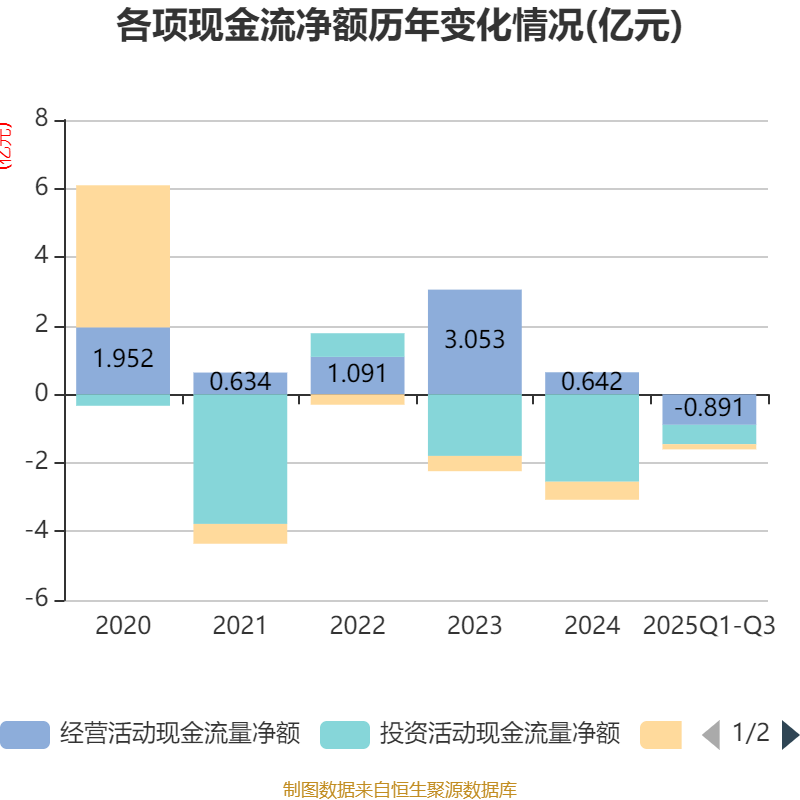 2025年前三季度,公司经营活动现金流净额为-8906.47万元,同比减少1.39亿元;筹资活动现金流净额-1532.28万元,同比增加3503.2万元;投资活动现金流净额-5627.92万元,上年同期为-1.92亿元。