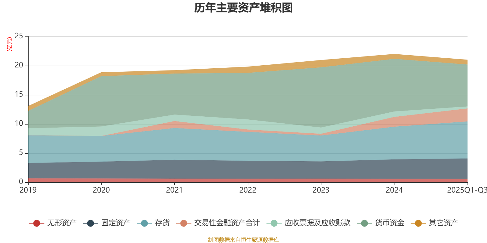 资产重大变化方面,截至2025年三季度末,公司货币资金较上年末减少20.28%,占公司总资产比重下降6.78个百分点;存货较上年末增加13.42%,占公司总资产比重上升4.77个百分点;交易性金融资产合计较上年末增加31.71%,占公司总资产比重上升2.92个百分点;应收票据及应收账款较上年末减少63.09%,占公司总资产比重下降2.61个百分点。