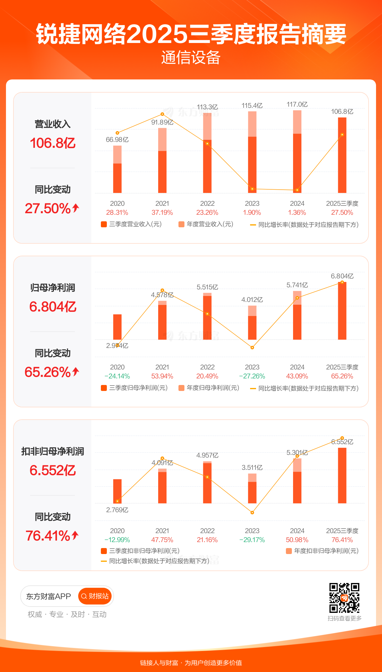 锐捷网络10月22日发布2025年三季报显示,公司前三季实现营业收入106.80亿元,同比增长27.50%;归母净利润6.80亿元,同比增长65.26%;扣非归母净利润6.55亿元,同比增长76.41%。每股EPS0.86元,低于机构一致预测的1.33元。
