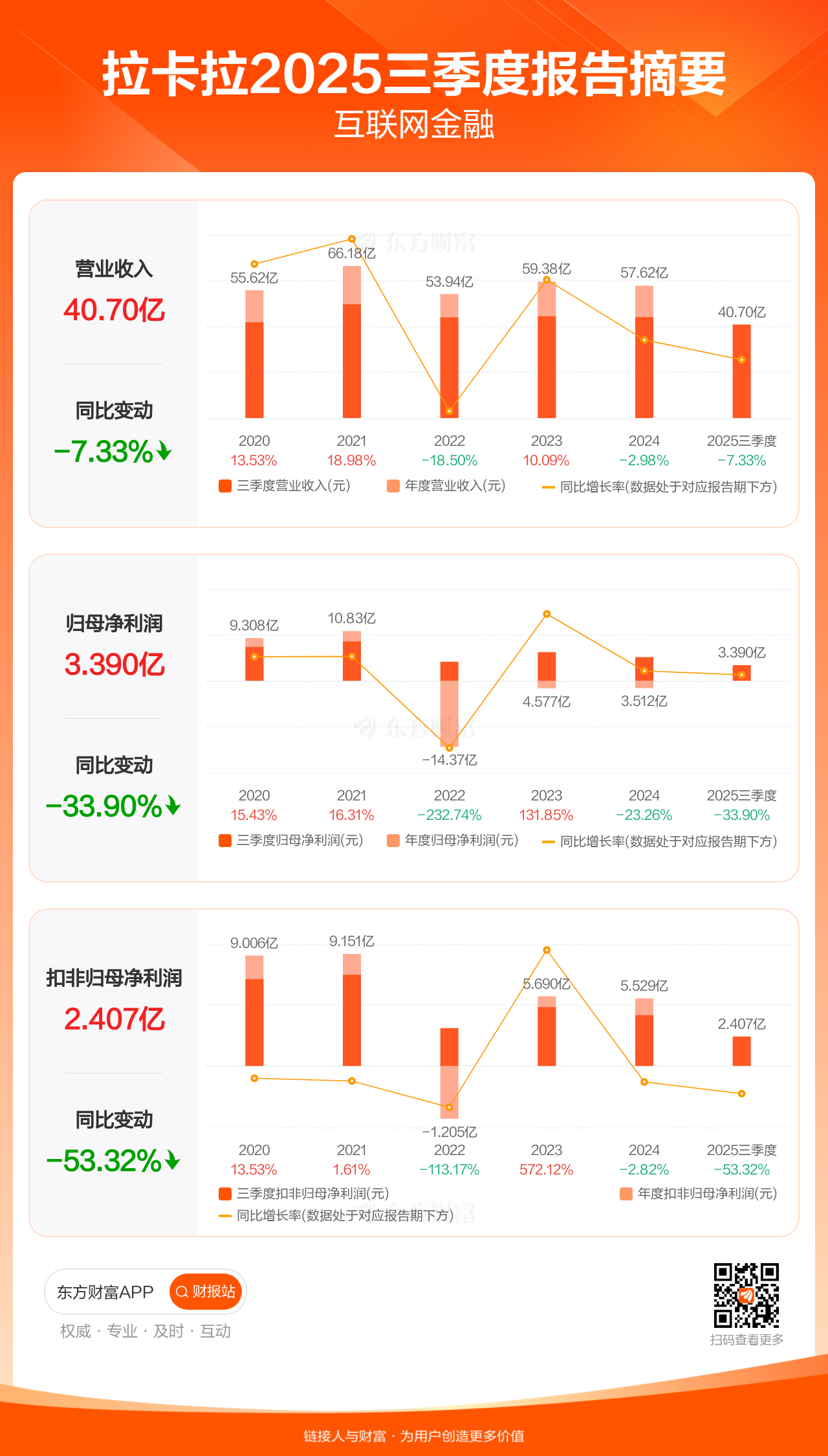 拉卡拉10月23日发布2025年三季报显示,公司前三季实现营业收入40.70亿元,同比下滑7.33%;归母净利润3.39亿元,同比下滑33.90%;扣非归母净利润2.41亿元,同比下滑53.32%。每股EPS0.44元,低于机构一致预测的0.67元。