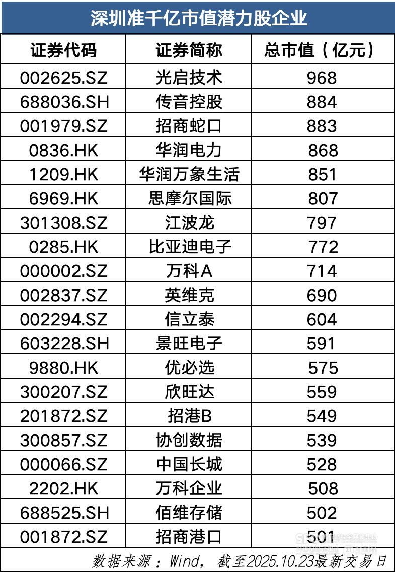 Wind数据显示,截至最新交易日,目前A股上市公司中,深圳共有18家企业市值超过千亿元;港股上市公司中,深圳共有10家企业市值超过千亿港元。与此同时,在A股市场和港股市场中,市值超过500亿元的企业有20家,这些企业涉猎人工智能、机器人、集成电路等战略性新兴产业赛道,有望冲刺千亿级别。