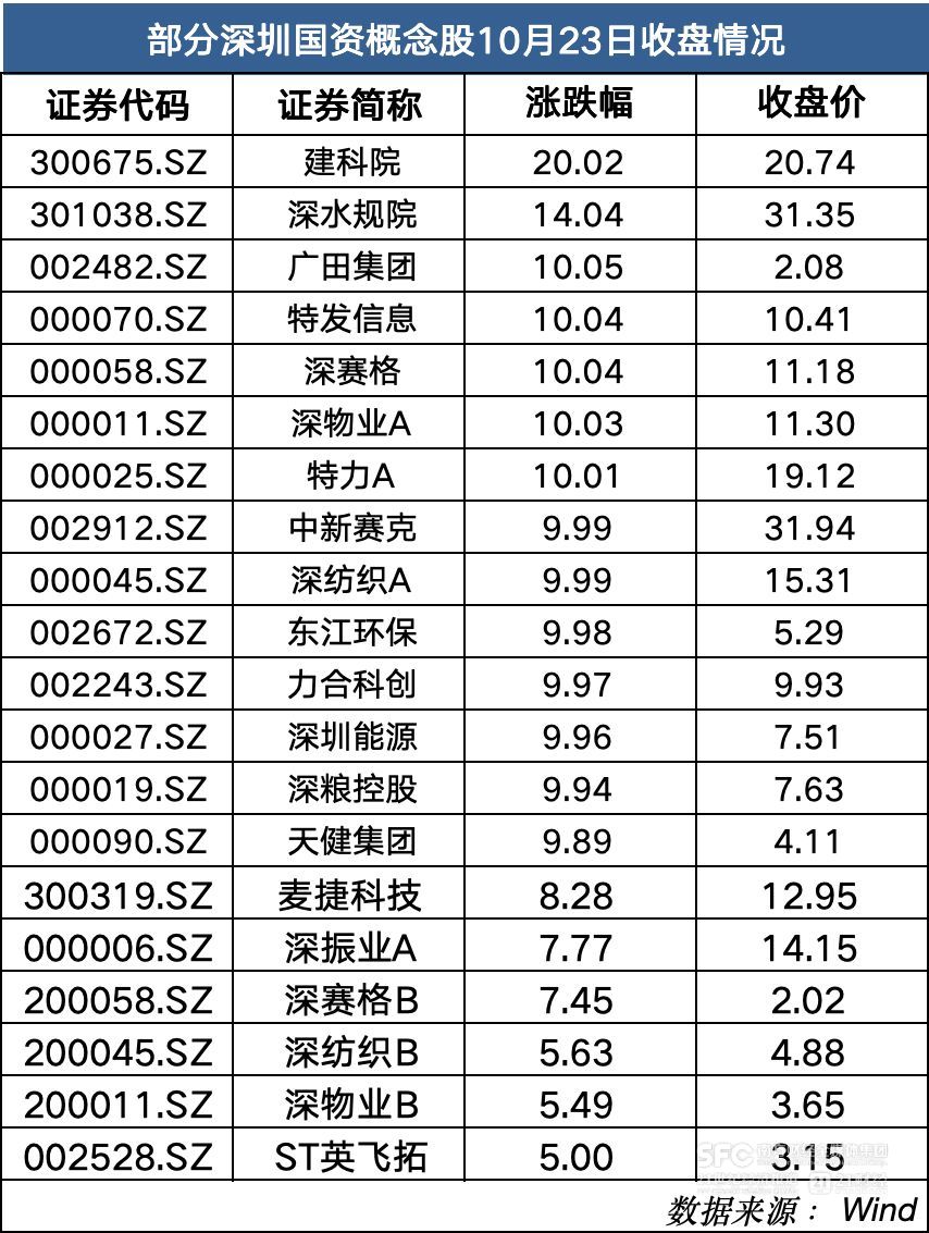 利好消息一出,深圳国资概念股集体大涨。截至10月23日收盘,建科院、深水规院、广田集团、特发信息、深赛格、深物业A、特力A等涨超10%。