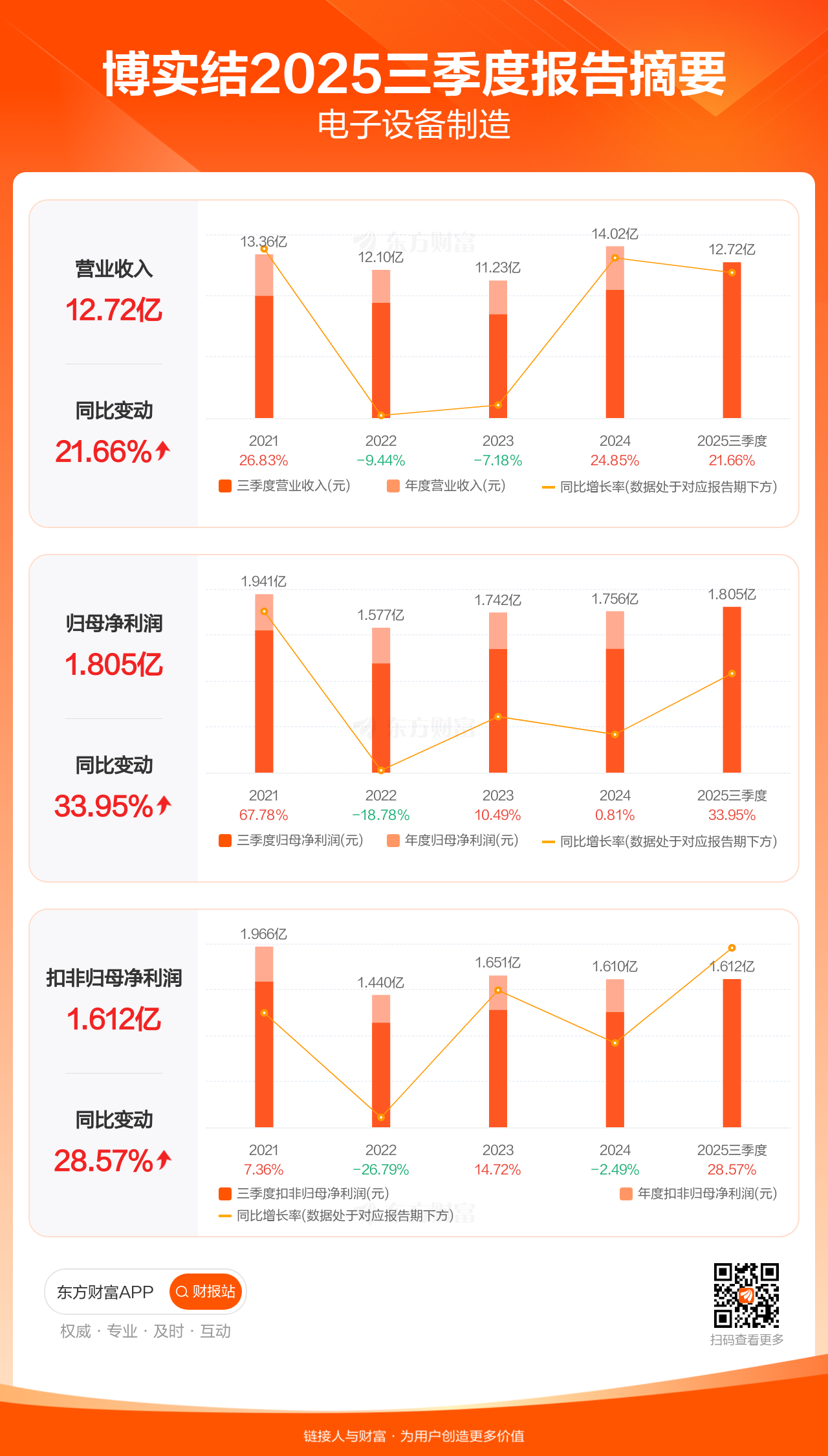 博实结10月24日发布2025年三季报显示,公司前三季实现营业收入12.72亿元,同比增长21.66%;归母净利润1.80亿元,同比增长33.95%;扣非归母净利润1.61亿元,同比增长28.57%。每股EPS2.03元,低于机构一致预测的2.54元。