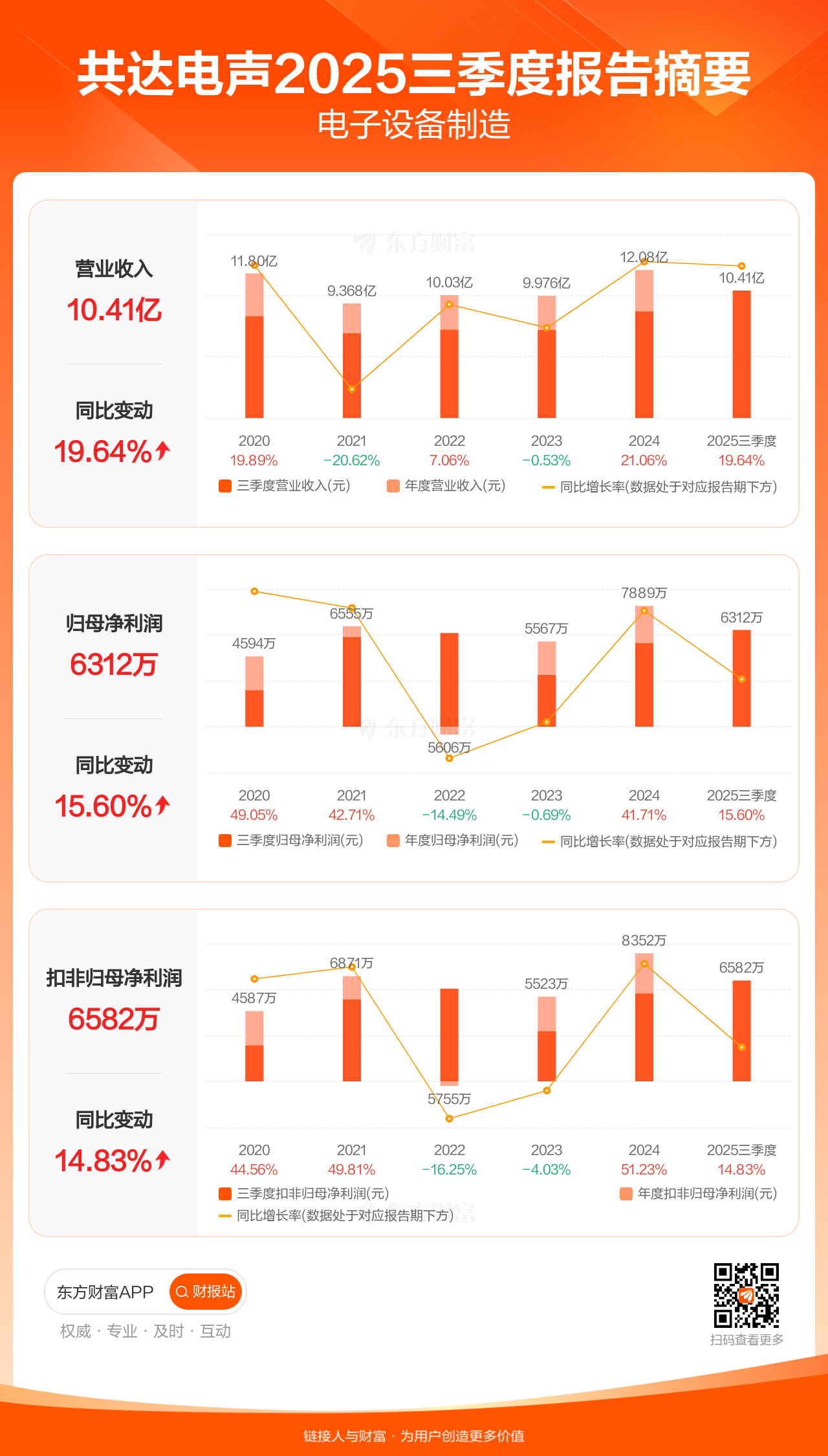 共达电声10月24日发布2025年三季报显示,公司前三季实现营业收入10.41亿元,同比增长19.64%;归母净利润6312.25万元,同比增长15.60%;扣非归母净利润6581.97万元,同比增长14.83%。每股EPS0.18元,高于机构一致预测的null元。