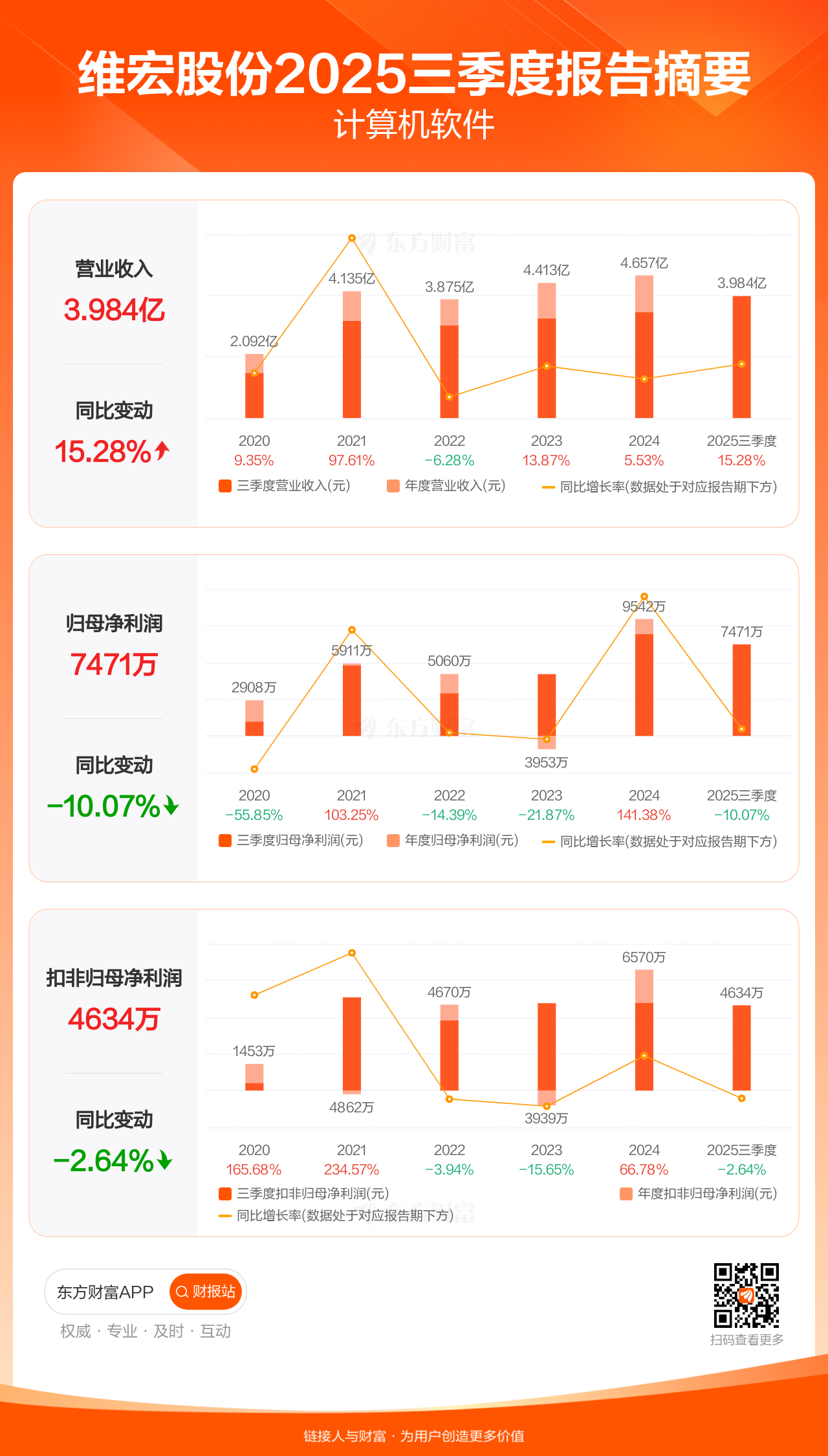 维宏股份10月24日发布2025年三季报显示,公司前三季实现营业收入3.98亿元,同比增长15.28%;归母净利润7471.07万元,同比下滑10.07%;扣非归母净利润4634.48万元,同比下滑2.64%。每股EPS0.68元,高于机构一致预测的null元。