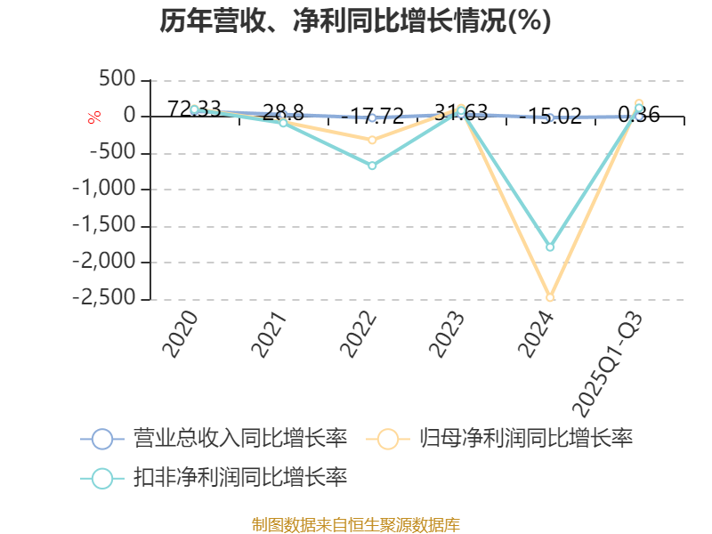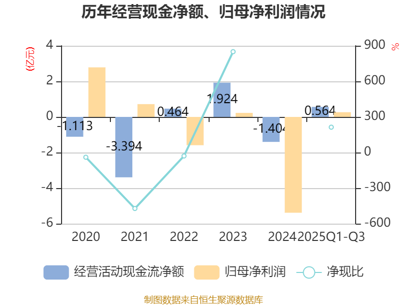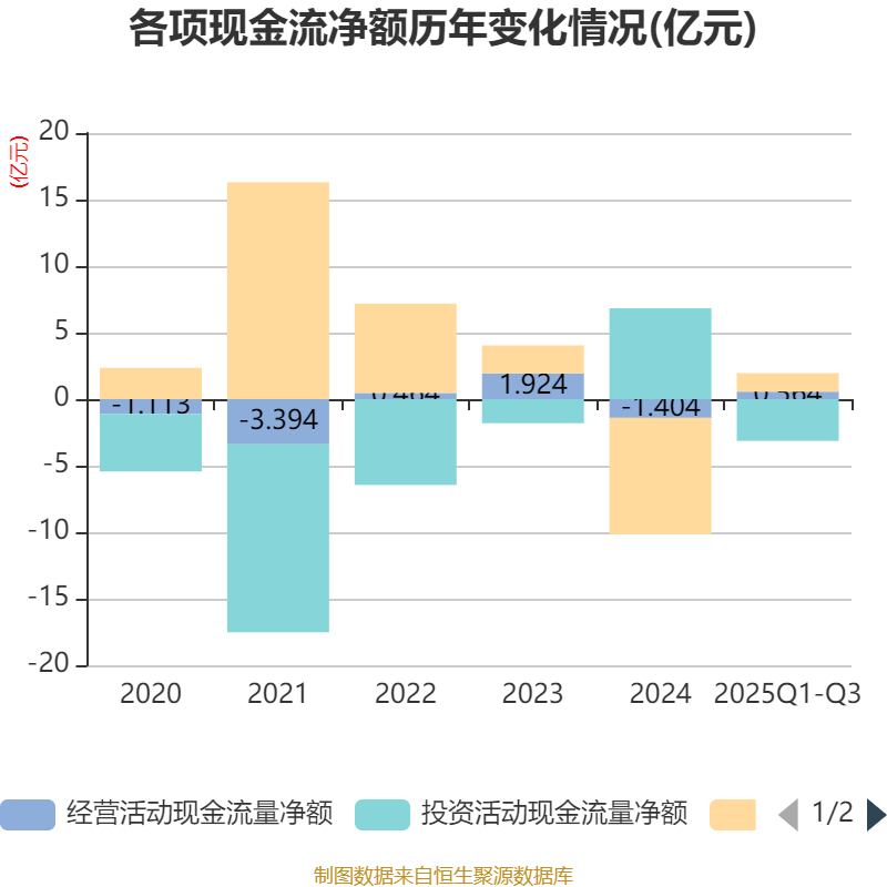 2025年前三季度,公司经营活动现金流净额为5635.92万元,同比增加5.7亿元;筹资活动现金流净额1.39亿元,同比增加3.89亿元;投资活动现金流净额-3.14亿元,上年同期为2.07亿元。