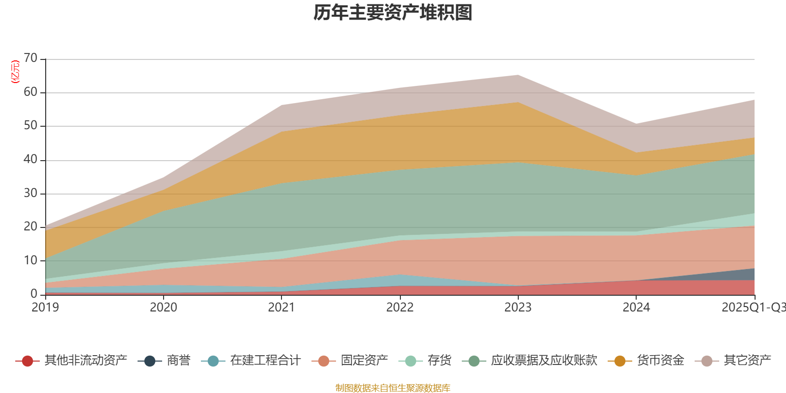 资产重大变化方面,截至2025年三季度末,公司商誉占公司总资产的6.11%,上年末为0;货币资金较上年末减少27.41%,占公司总资产比重下降4.87个百分点;固定资产较上年末减少5.07%,占公司总资产比重下降4.4个百分点;存货较上年末增加224.9%,占公司总资产比重上升4.09个百分点。