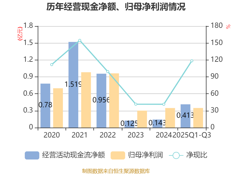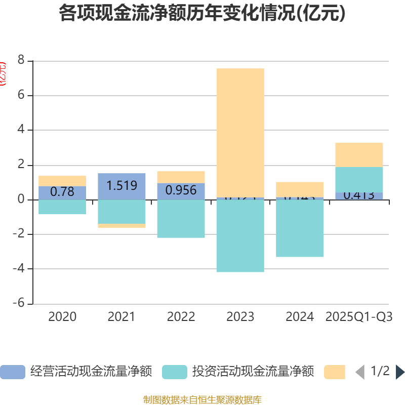 2025年前三季度,公司经营活动现金流净额为4128.52万元,同比增长84.36%;筹资活动现金流净额1.4亿元,同比增加1.09亿元;投资活动现金流净额1.46亿元,上年同期为-3.03亿元。