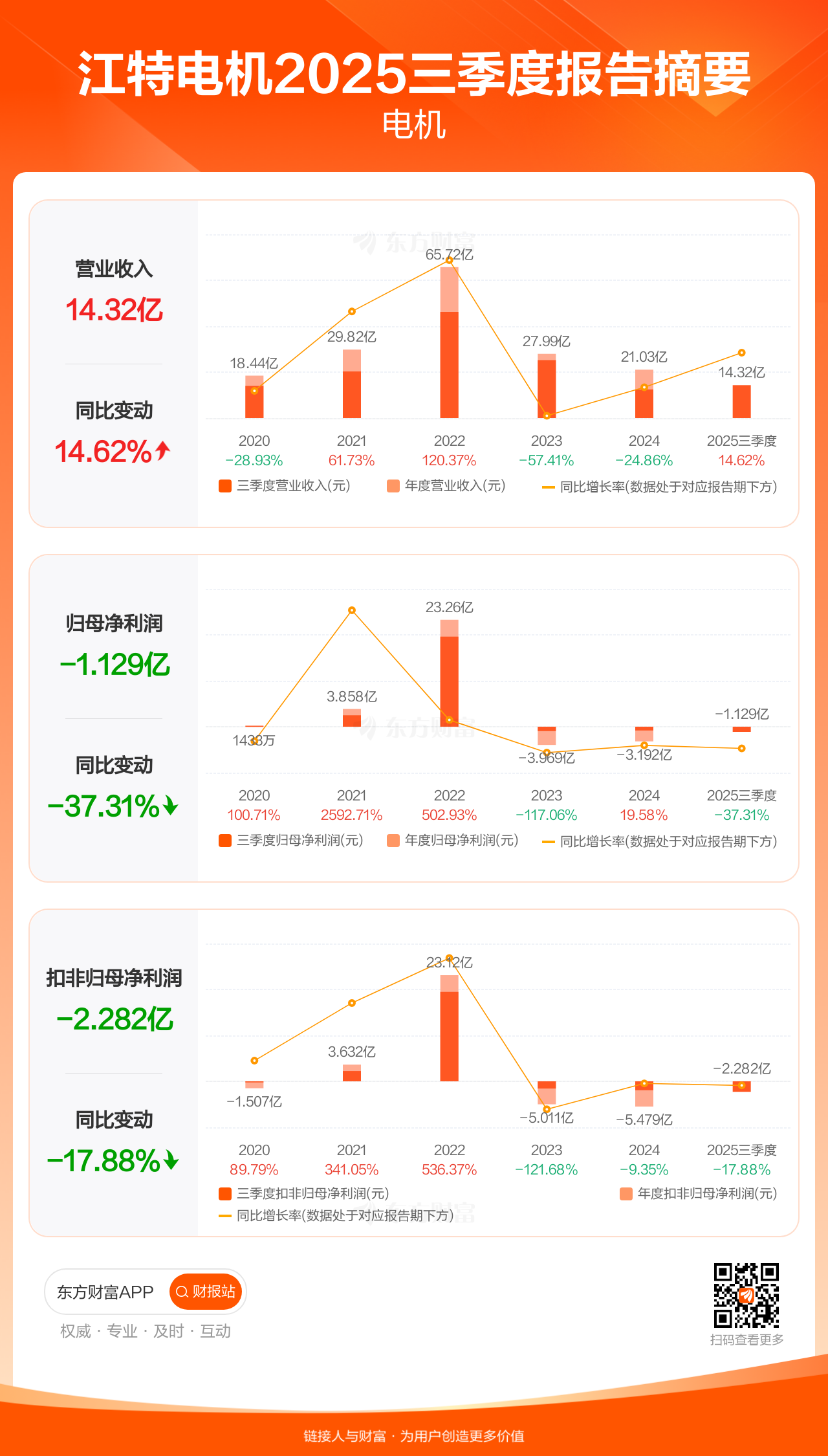 江特电机10月24日发布2025年三季报显示,公司前三季实现营业收入14.32亿元,同比增长14.62%;归母净利润-1.13亿元;扣非归母净利润-2.28亿元。每股EPS-0.07元,高于机构一致预测的null元。