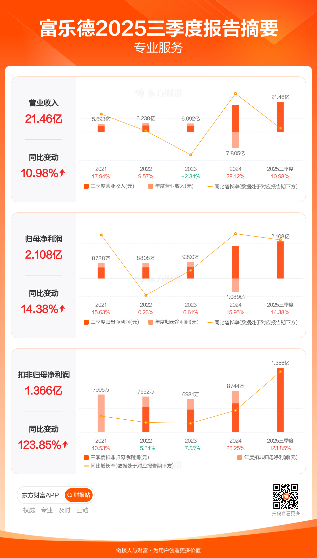 富乐德10月24日发布2025年三季报显示,公司前三季实现营业收入21.46亿元,同比增长10.98%;归母净利润2.11亿元,同比增长14.38%;扣非归母净利润1.37亿元,同比增长123.85%。每股EPS0.37元,高于机构一致预测的null元。