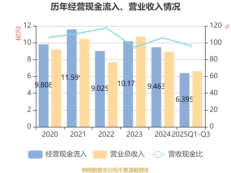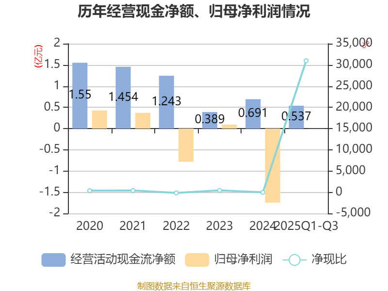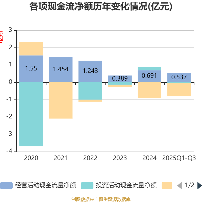 2025年前三季度,公司经营活动现金流净额为5370.55万元,同比增长29.13%;筹资活动现金流净额-7497.27万元,同比减少1256.41万元;投资活动现金流净额-438.87万元,上年同期为621.02万元。