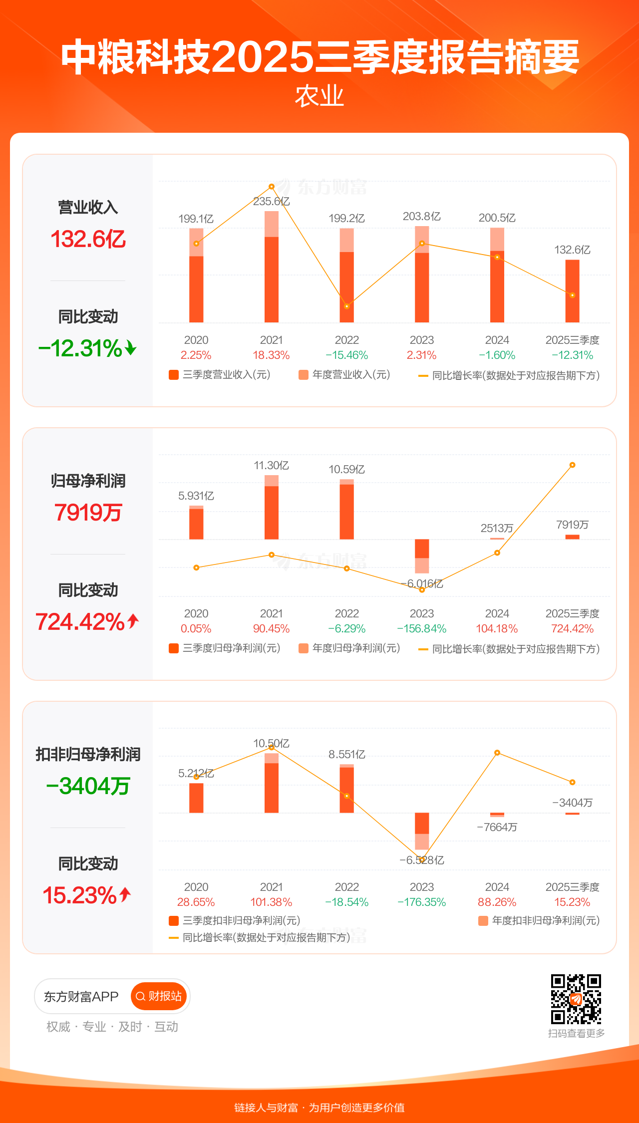 中粮科技10月24日发布2025年三季报显示,公司前三季实现营业收入132.62亿元,同比下滑12.31%;归母净利润7918.60万元,同比增长724.42%;扣非归母净利润-3404.07万元。每股EPS0.04元,低于机构一致预测的0.05元。
