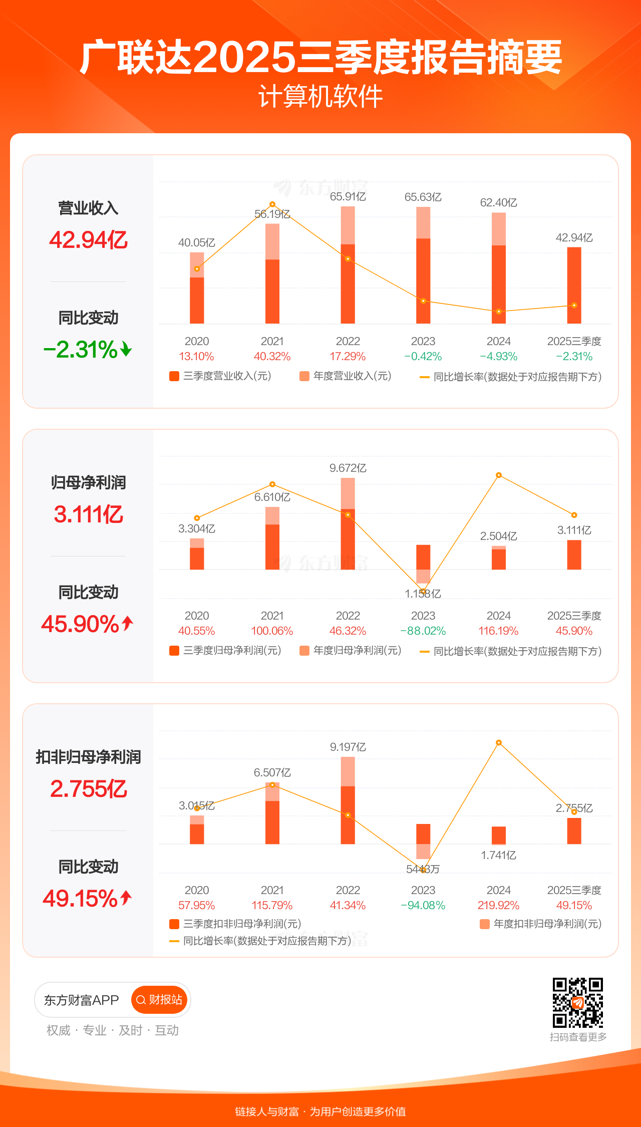 广联达10月24日发布2025年三季报显示,公司前三季实现营业收入42.94亿元,同比下滑2.31%;归母净利润3.11亿元,同比增长45.90%;扣非归母净利润2.75亿元,同比增长49.15%。每股EPS0.19元,低于机构一致预测的0.29元。