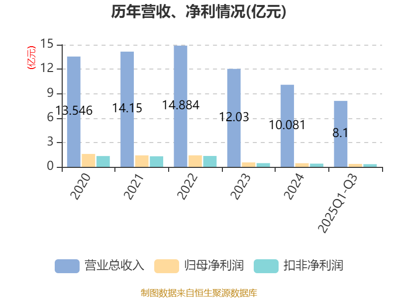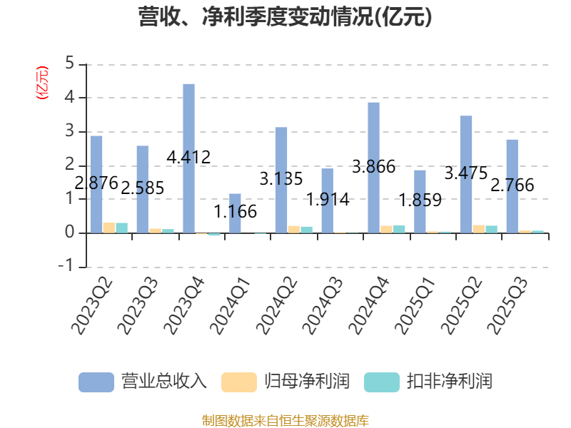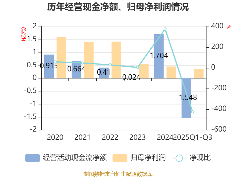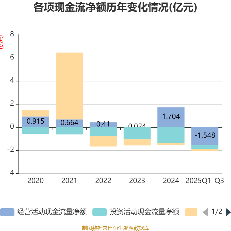 2025年前三季度,公司经营活动现金流净额为-1.55亿元,同比减少1.37亿元;筹资活动现金流净额-1763.73万元,同比减少2969.65万元;投资活动现金流净额-3279.23万元,上年同期为-1.08亿元。