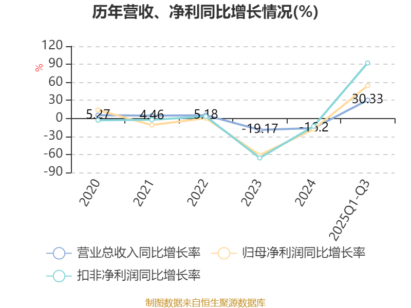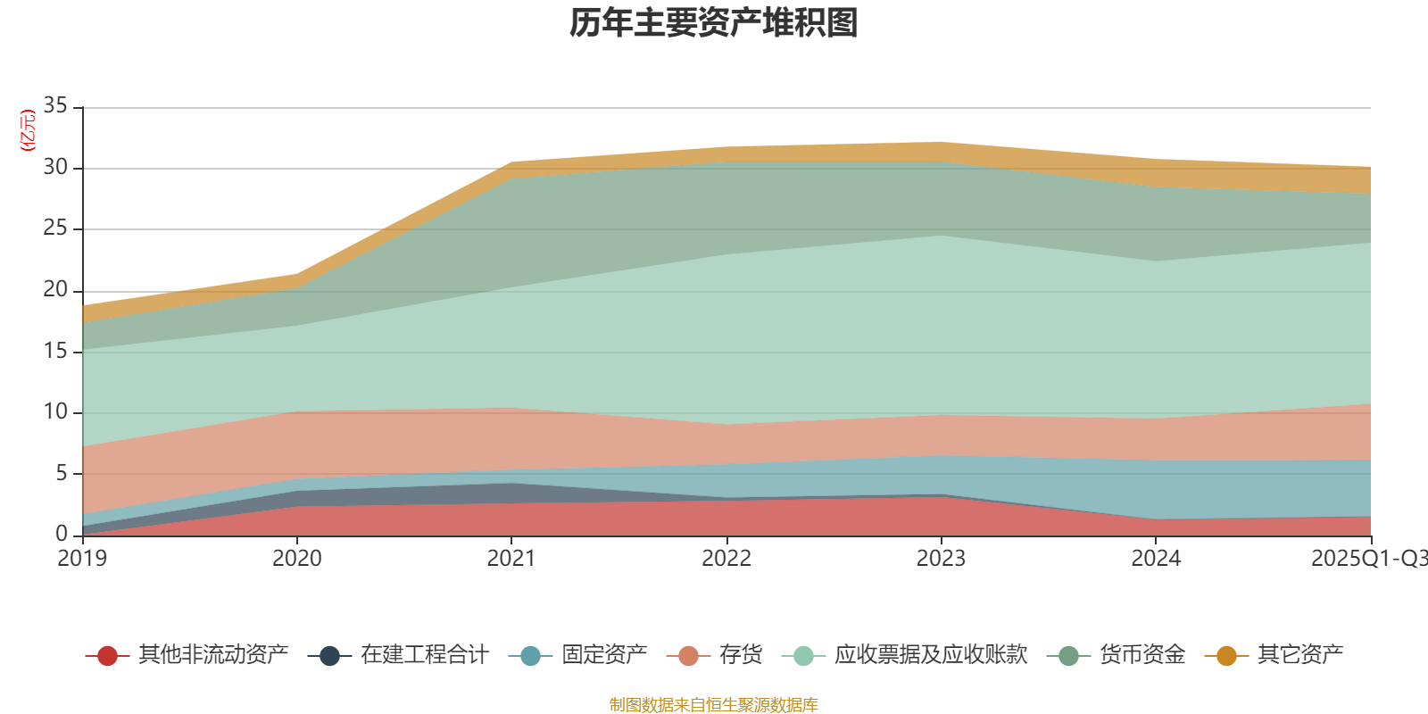 资产重大变化方面,截至2025年三季度末,公司货币资金较上年末减少33.83%,占公司总资产比重下降6.4个百分点;存货较上年末增加36.42%,占公司总资产比重上升4.34个百分点;应收票据及应收账款较上年末增加2.4%,占公司总资产比重上升1.91个百分点;其他非流动资产较上年末增加16.31%,占公司总资产比重上升0.79个百分点。
