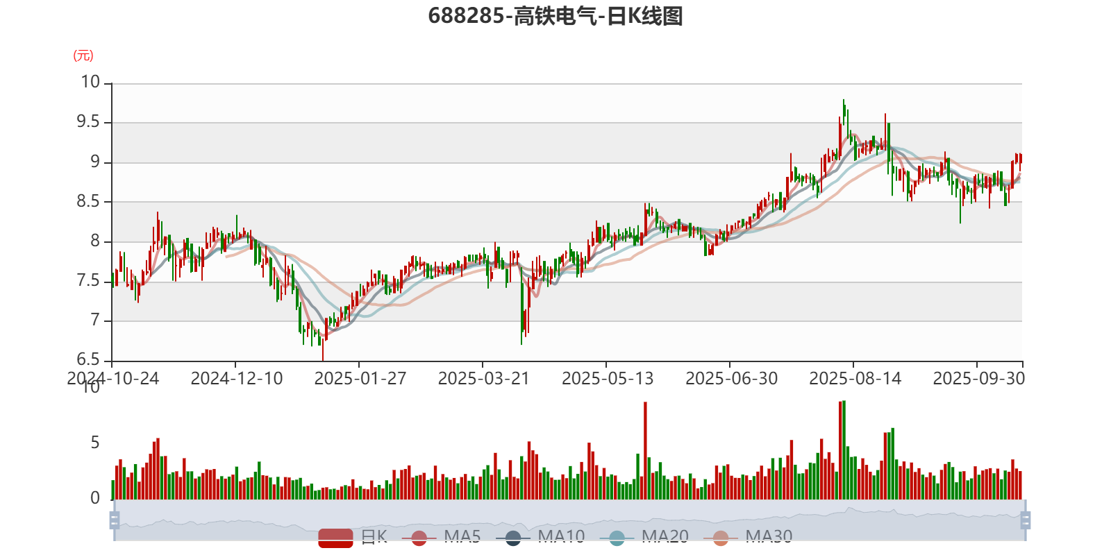 中证智能财讯高铁电气(688285)10月24日披露2025年第三季度报告。前三季度公司实现营业总收入8.1亿元,同比增长30.33%;归母净利润3632.95万元,同比增长54.32%;扣非净利润3308.01万元,同比增长92.15%;经营活动产生的现金流量净额为-1.55亿元,上年同期为-1731.71万元;报告期内,高铁电气基本每股收益为0.0965元,加权平均净资产收益率为2.19%。