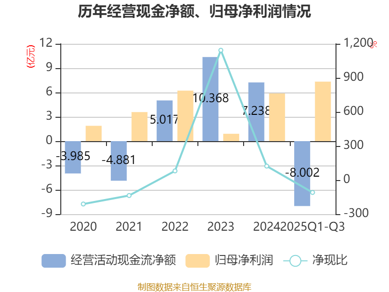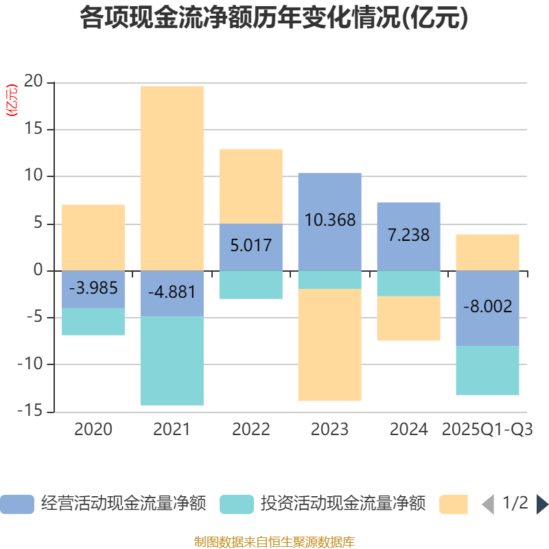 2025年前三季度,公司经营活动现金流净额为-8亿元,同比减少11.07亿元;筹资活动现金流净额3.84亿元,同比增加5.86亿元;投资活动现金流净额-5.23亿元,上年同期为-2.03亿元。