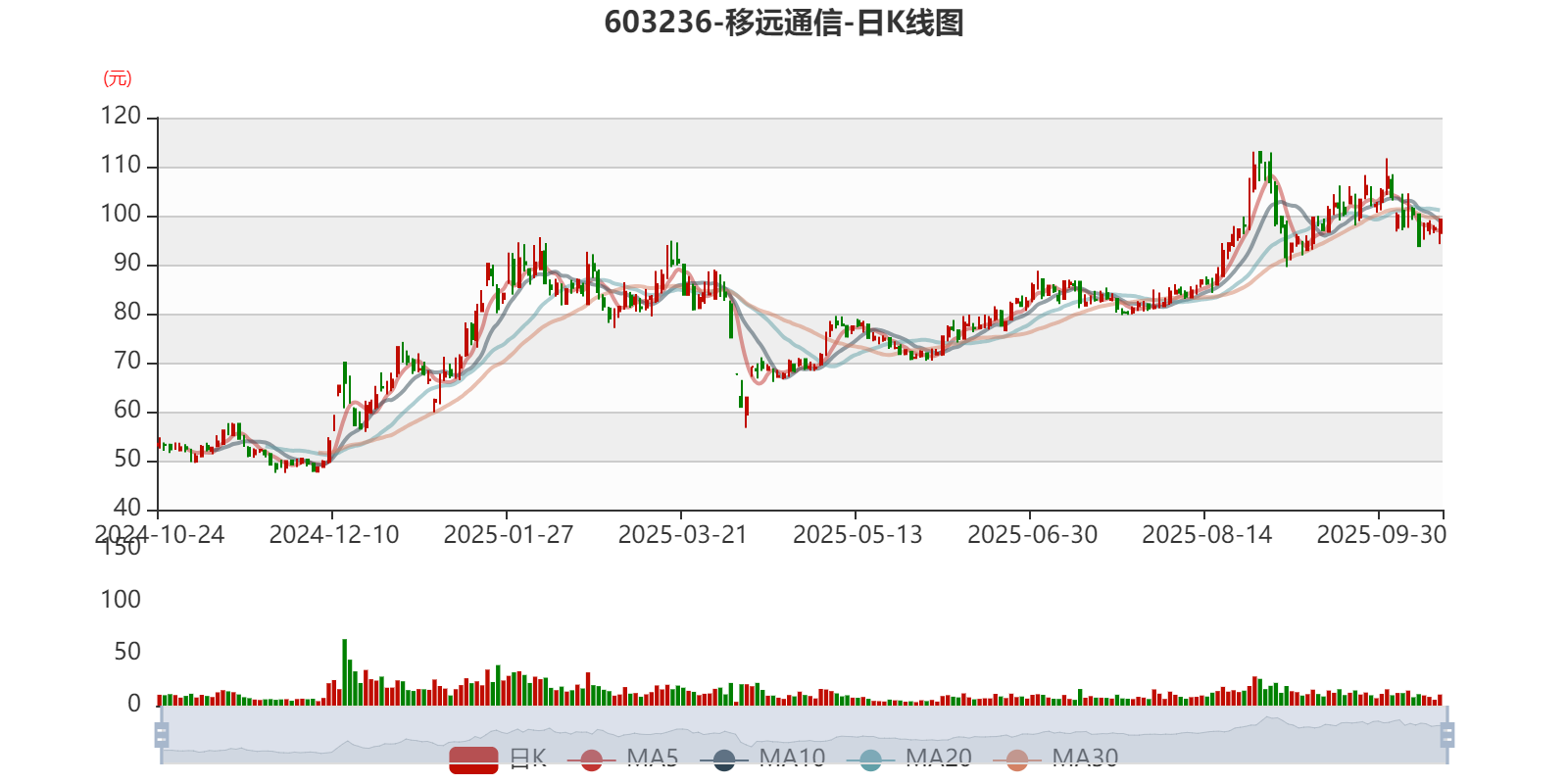 中证智能财讯移远通信(603236)10月24日披露2025年第三季度报告。前三季度公司实现营业总收入178.77亿元,同比增长34.96%;归母净利润7.33亿元,同比增长105.65%;扣非净利润6.94亿元,同比增长113.27%;经营活动产生的现金流量净额为-8亿元,上年同期为3.07亿元;报告期内,移远通信基本每股收益为2.8元,加权平均净资产收益率为16.69%。