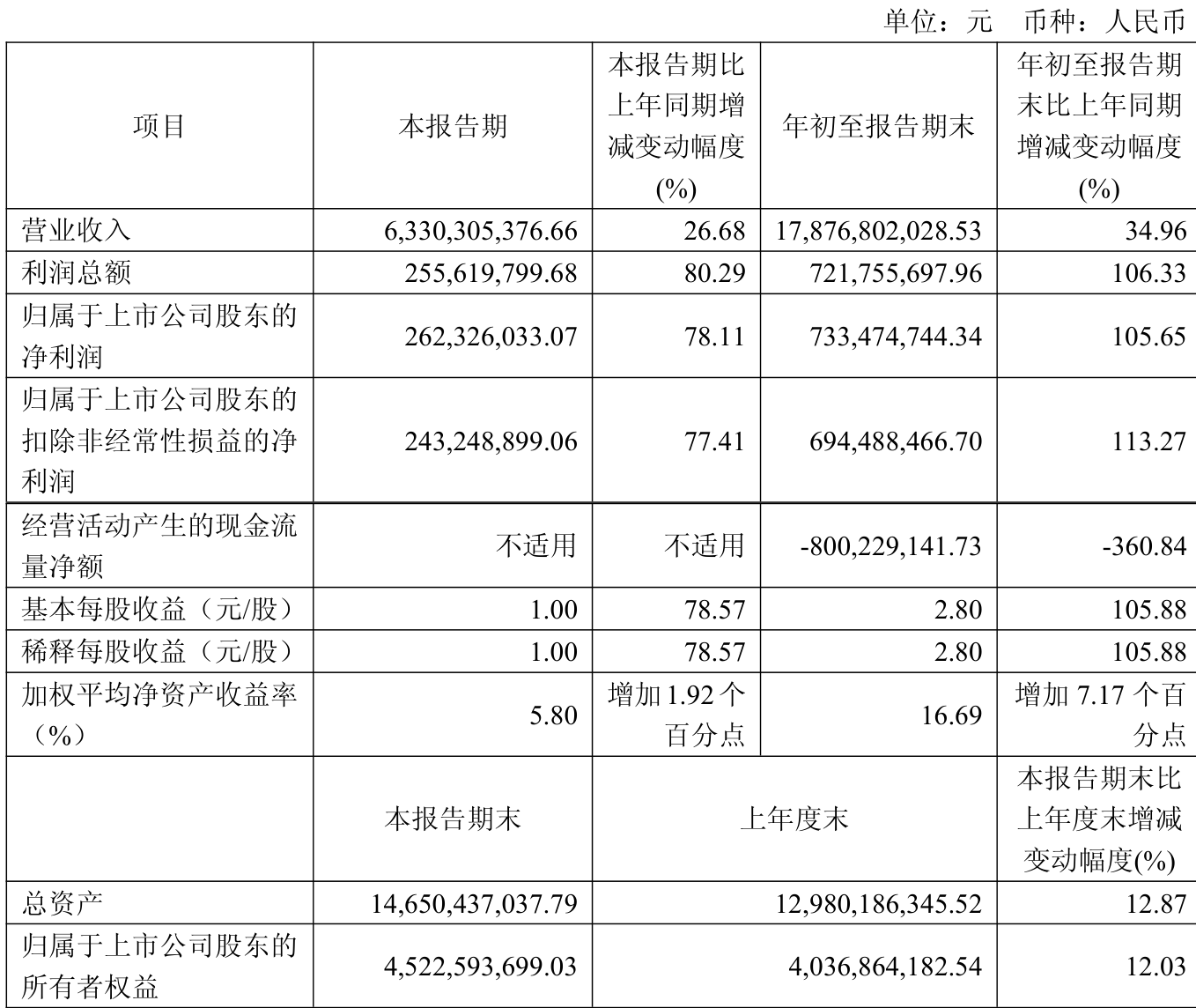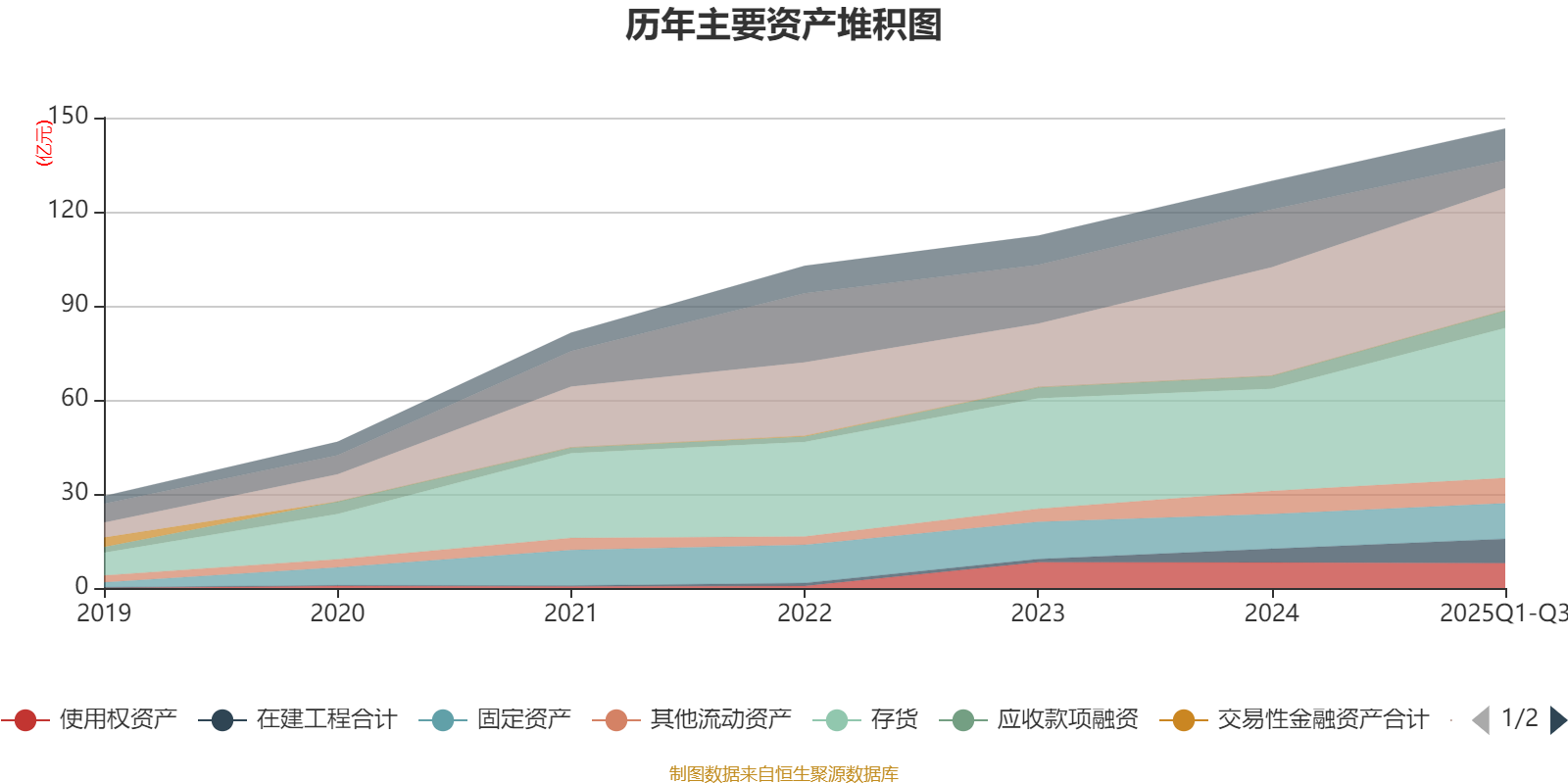 资产重大变化方面,截至2025年三季度末,公司货币资金较上年末减少51.32%,占公司总资产比重下降8.05个百分点;存货较上年末增加46.64%,占公司总资产比重上升7.51个百分点;在建工程合计较上年末增加75.92%,占公司总资产比重上升1.9个百分点;其他应收款(含利息和股利)较上年末减少45.83%,占公司总资产比重下降1.14个百分点。