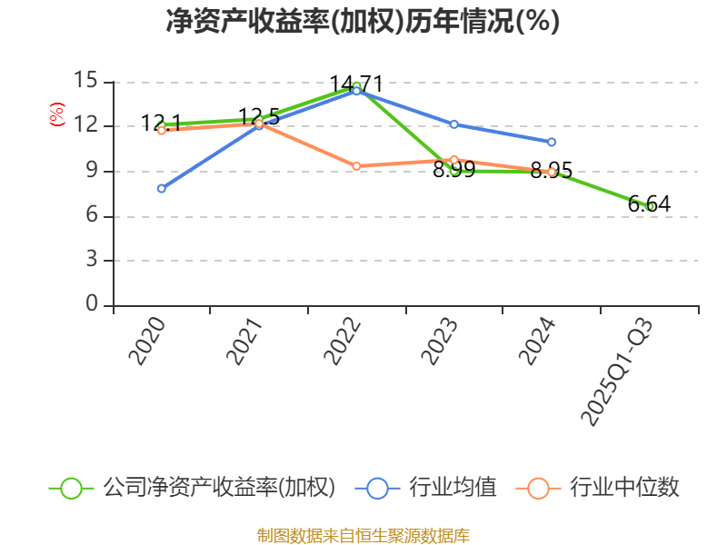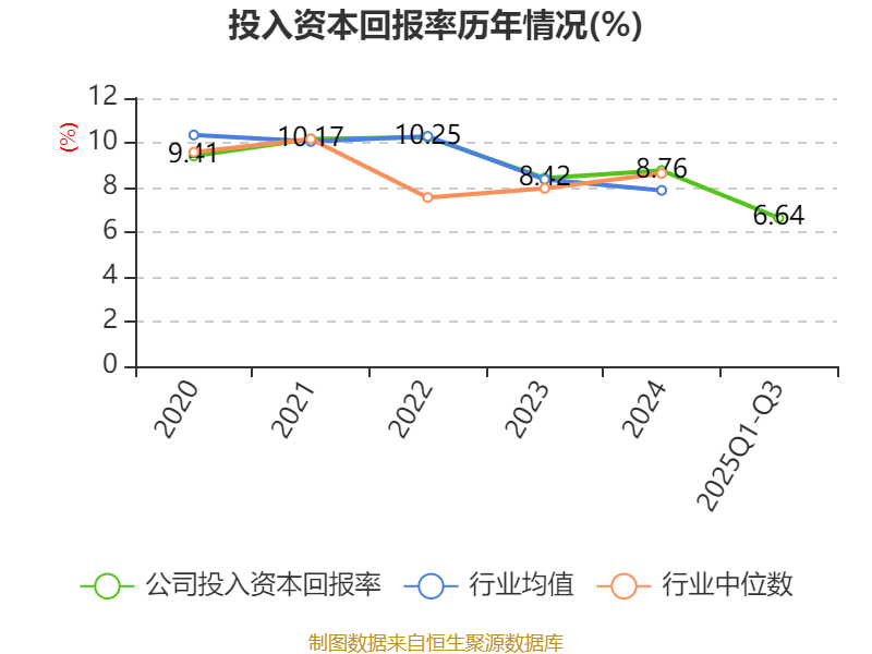 盈利能力方面, 2025年前三季度公司加权平均净资产收益率为6.64%,同比下降0.8个百分点。公司2025年前三季度投入资本回报率为6.64%,较上年同期下降0.64个百分点。