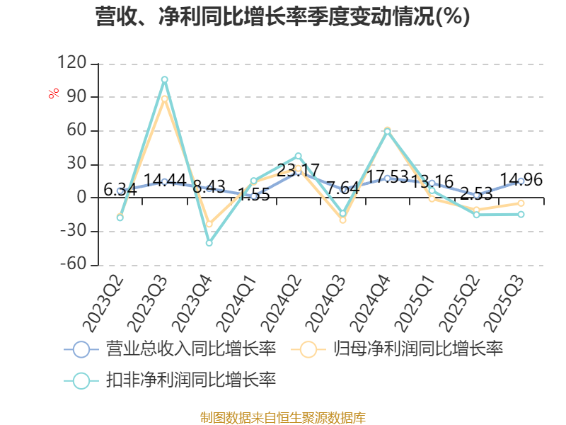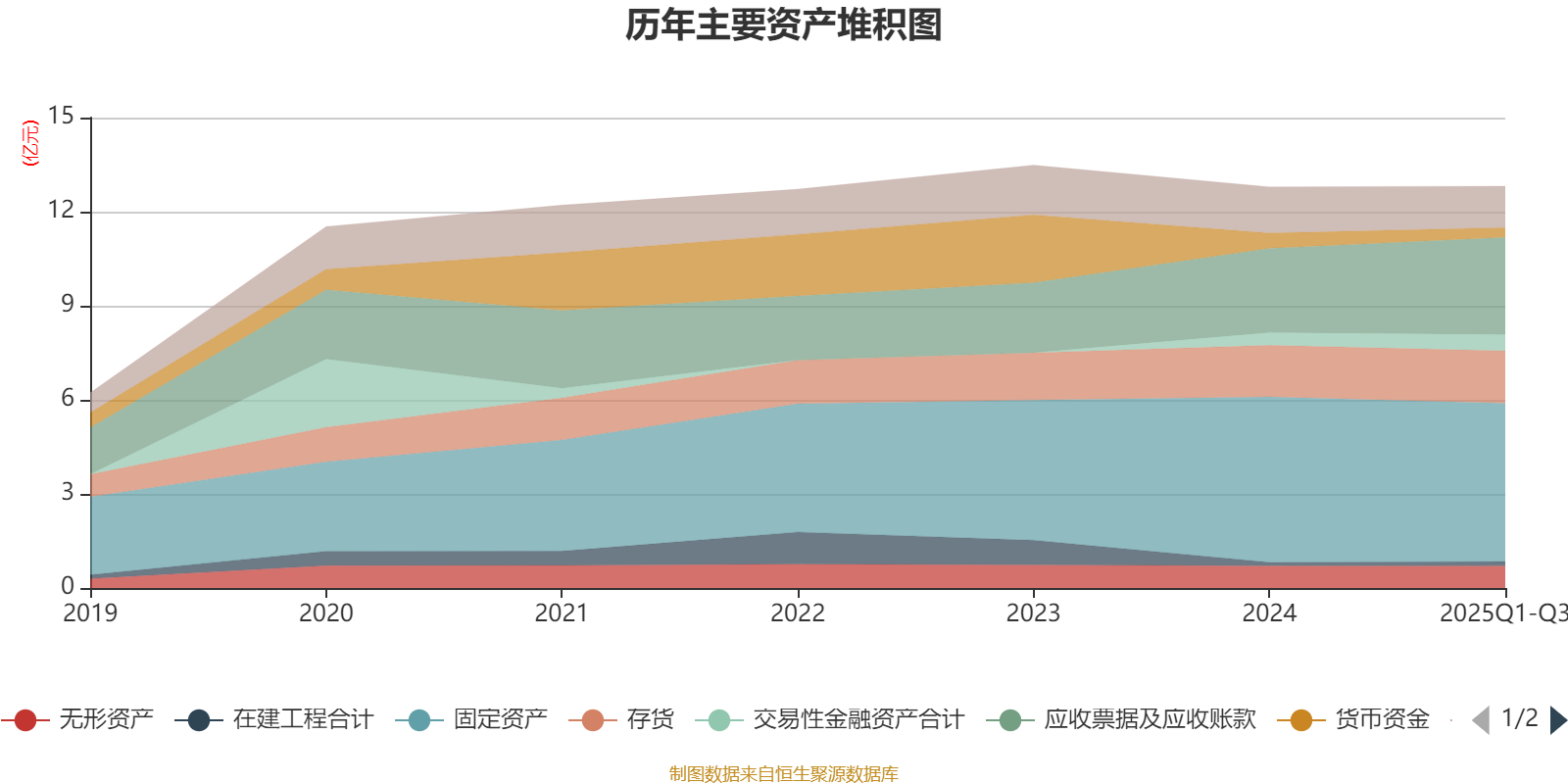 资产重大变化方面,截至2025年三季度末,公司应收票据及应收账款较上年末增加15.42%,占公司总资产比重上升3.19个百分点;固定资产较上年末减少4.21%,占公司总资产比重下降1.81个百分点;货币资金较上年末减少35.55%,占公司总资产比重下降1.35个百分点;交易性金融资产合计较上年末增加27.07%,占公司总资产比重上升0.84个百分点。