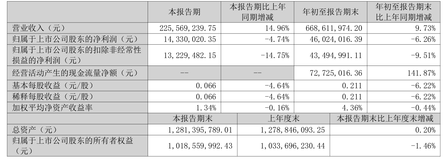 中证智能财讯双飞集团(300817)10月24日披露2025年第三季度报告。前三季度公司实现营业总收入6.69亿元,同比增长9.73%;归母净利润4602.4万元,同比下降6.26%;扣非净利润4349.5万元,同比下降9.51%;经营活动产生的现金流量净额为7272.5万元,同比增长141.87%;报告期内,双飞集团基本每股收益为0.211元,加权平均净资产收益率为4.36%。