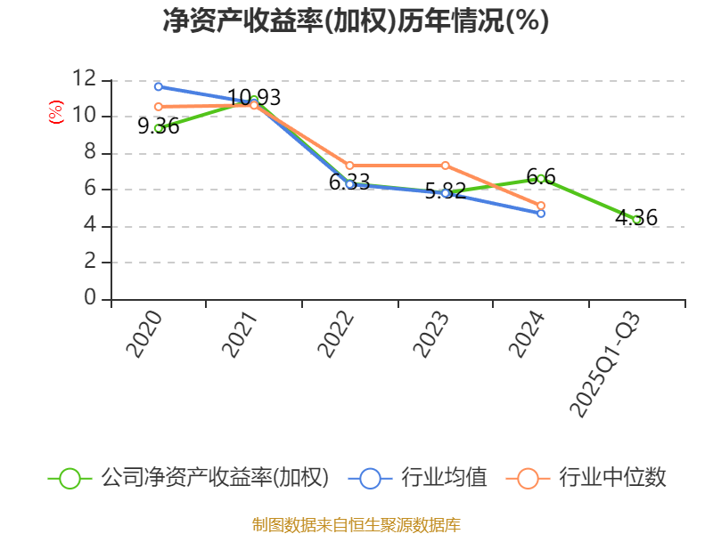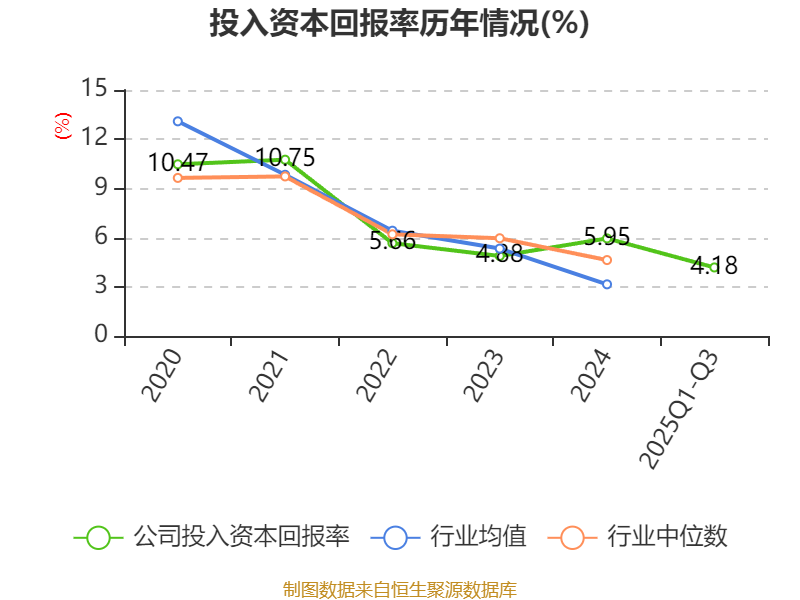 盈利能力方面, 2025年前三季度公司加权平均净资产收益率为4.36%,同比下降0.44个百分点。公司2025年前三季度投入资本回报率为4.18%,较上年同期下降0.08个百分点。