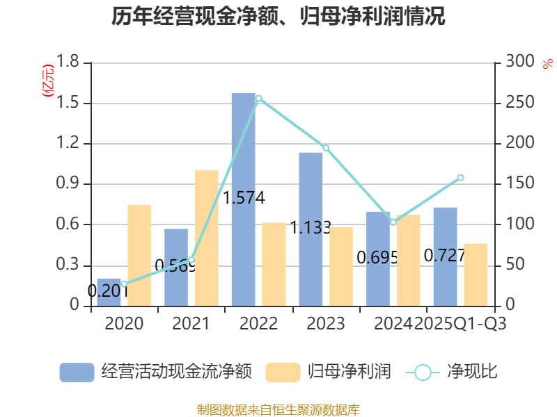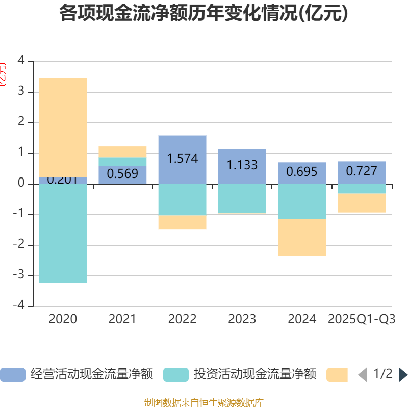 2025年前三季度,公司经营活动现金流净额为7272.5万元,同比增长141.87%;筹资活动现金流净额-6173.57万元,同比增加3192.28万元;投资活动现金流净额-3265.35万元,上年同期为-1.08亿元。