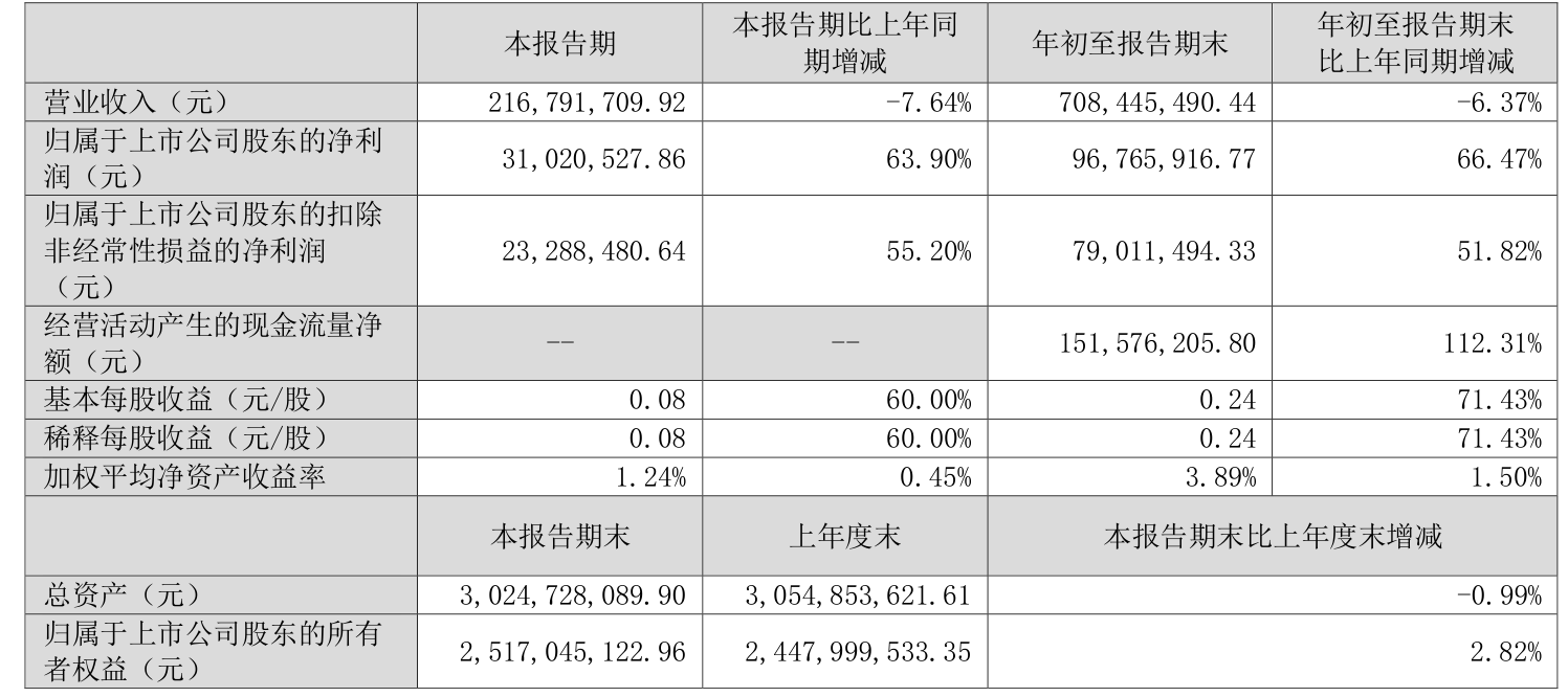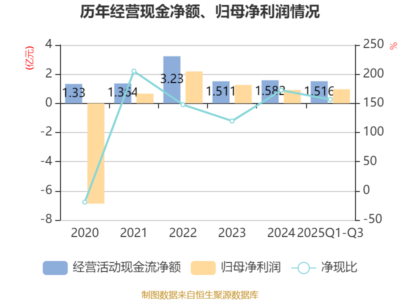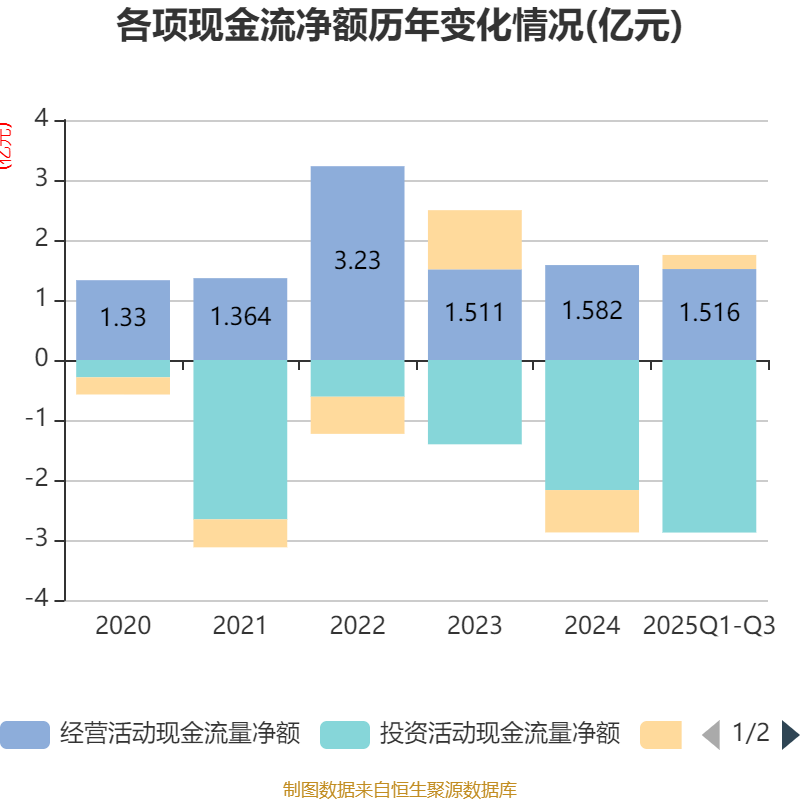 2025年前三季度,公司经营活动现金流净额为1.52亿元,同比增长112.31%;筹资活动现金流净额2348.08万元,同比增加7345.98万元;投资活动现金流净额-2.88亿元,上年同期为-2.1亿元。