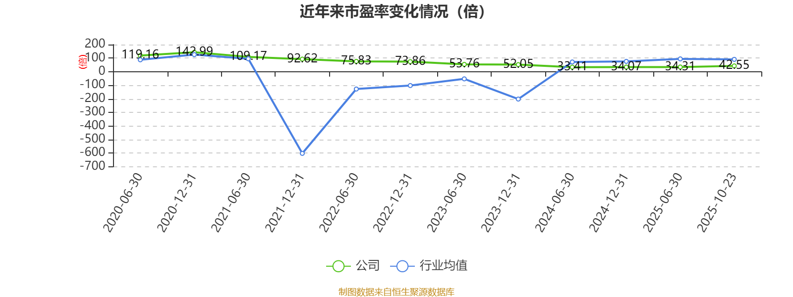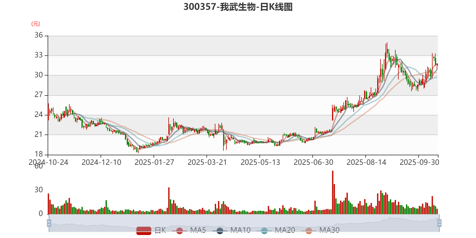 以10月23日收盘价计算,我武生物目前市盈率(TTM)约为42.55倍,市净率(LF)约6.3倍,市销率(TTM)约15.84倍。