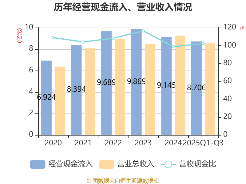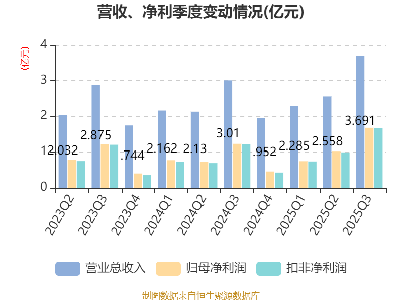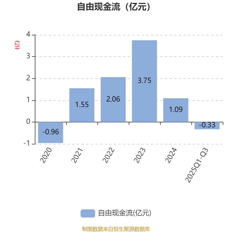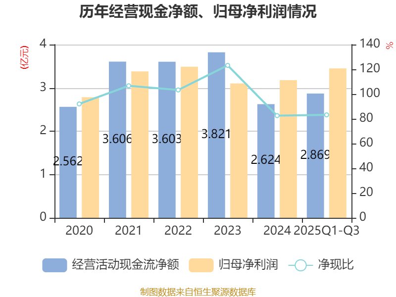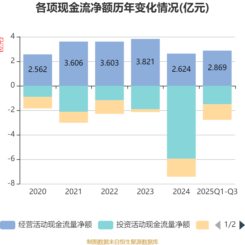2025年前三季度,公司经营活动现金流净额为2.87亿元,同比增长79.11%;筹资活动现金流净额-1.28亿元,同比减少748.08万元;投资活动现金流净额-1.5亿元,上年同期为-5.45亿元。