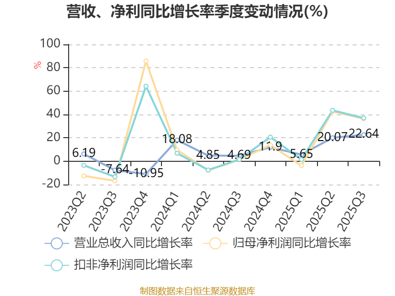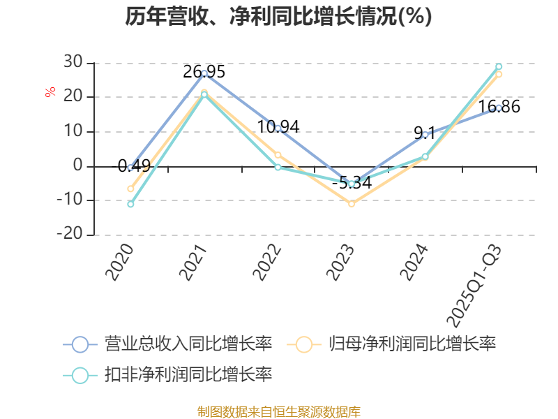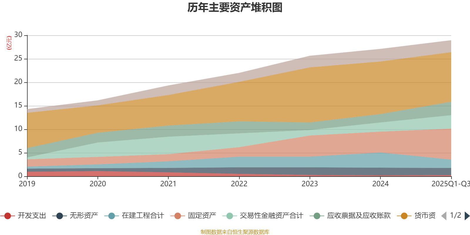 资产重大变化方面,截至2025年三季度末,公司固定资产较上年末增加48.56%,占公司总资产比重上升6.4个百分点;在建工程合计较上年末减少44.69%,占公司总资产比重下降5.75个百分点;货币资金较上年末减少5.69%,占公司总资产比重下降4.83个百分点;应收票据及应收账款较上年末增加60.1%,占公司总资产比重上升3.28个百分点。