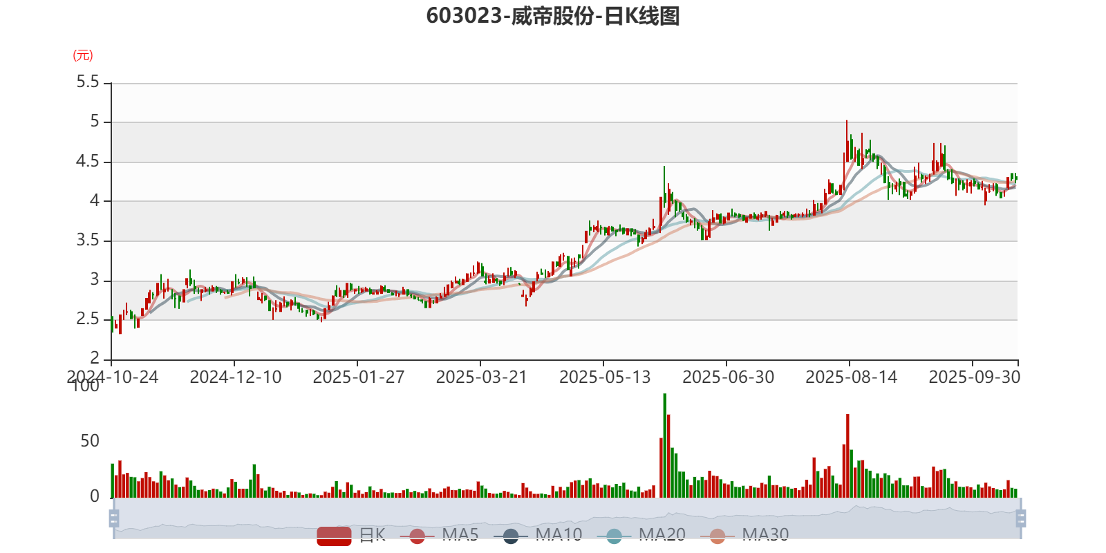 中证智能财讯威帝股份(603023)10月24日披露2025年第三季度报告。前三季度公司实现营业总收入1.1亿元,同比增长138.73%;归母净利润70.58万元,同比下降80.11%;扣非净利润23.48万元,同比下降92.40%;经营活动产生的现金流量净额为-3231.84万元,上年同期为1355.34万元;报告期内,威帝股份基本每股收益为0.0013元,加权平均净资产收益率为0.09%。
