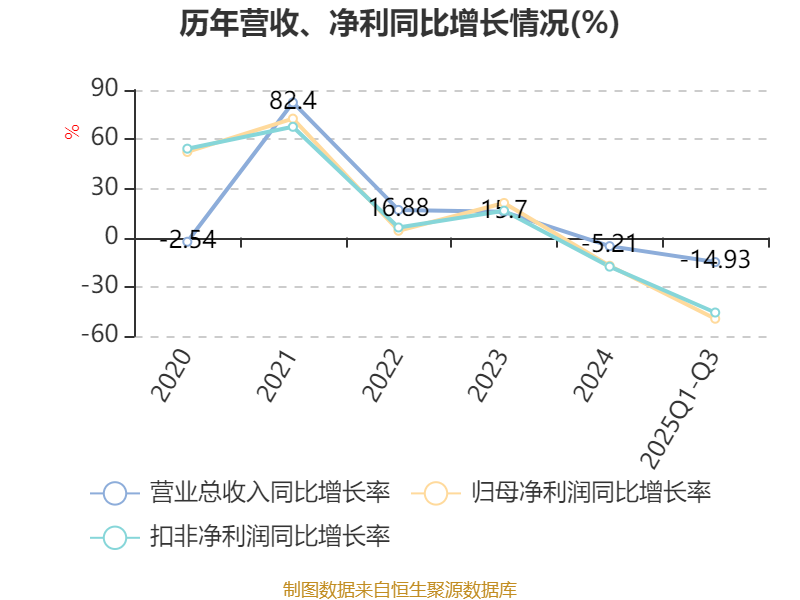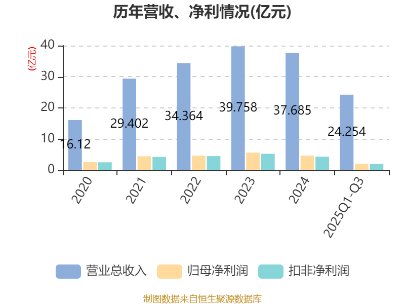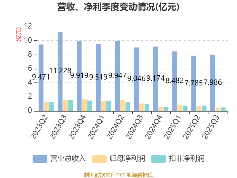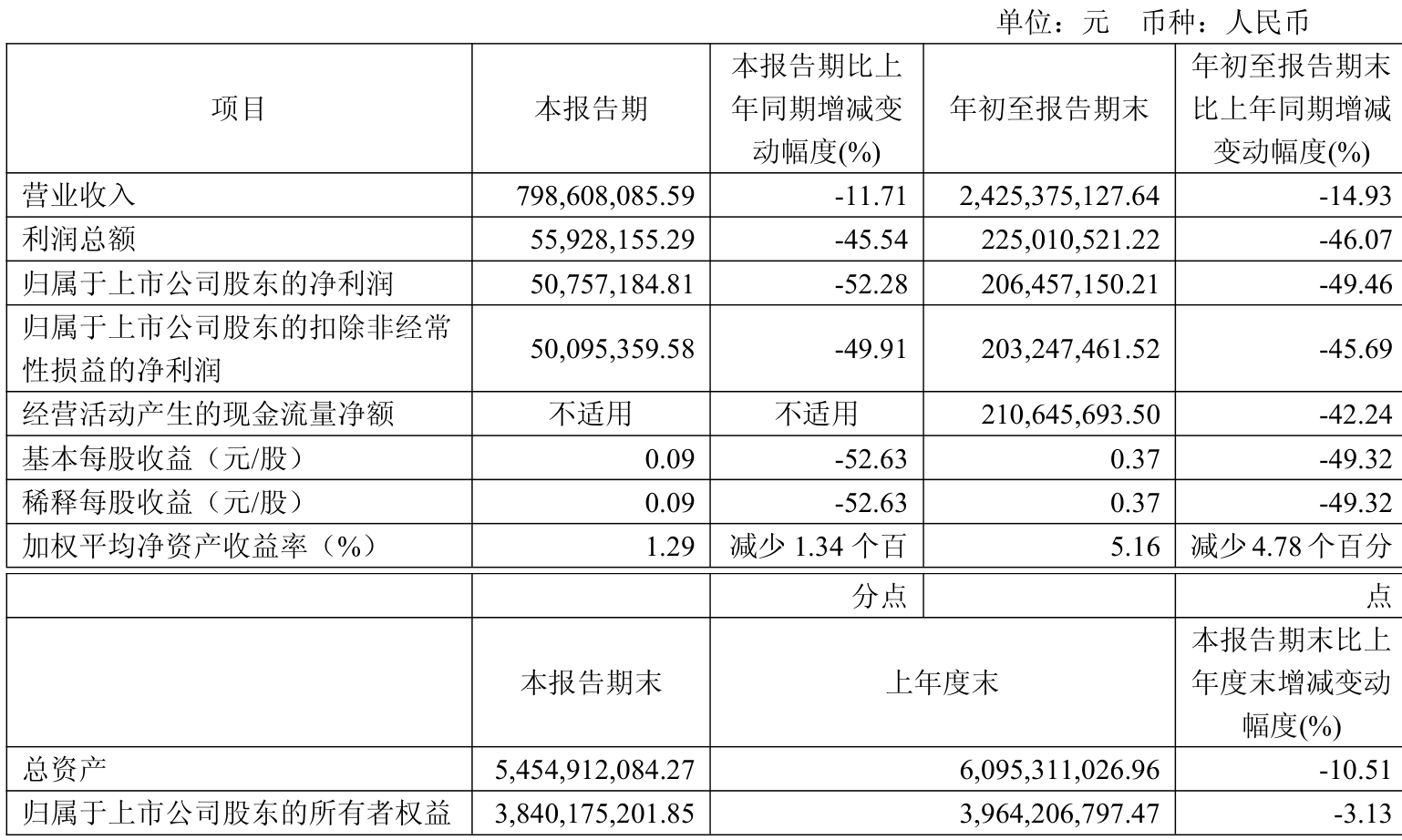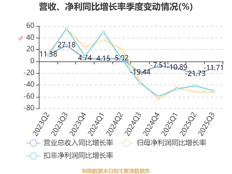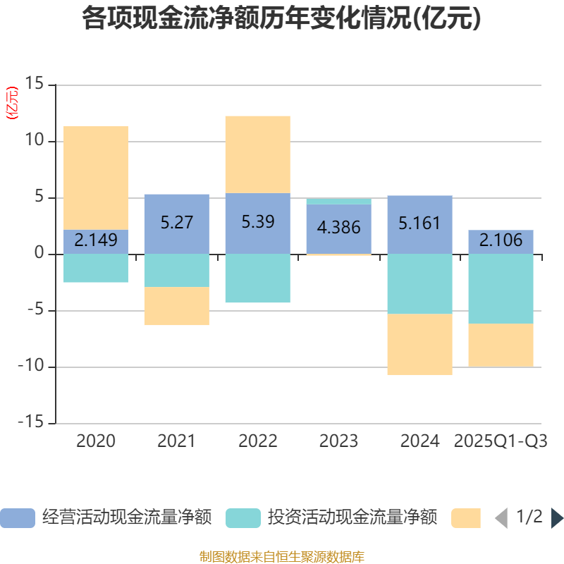 2025年前三季度,公司经营活动现金流净额为2.11亿元,同比下降42.24%;筹资活动现金流净额-3.79亿元,同比减少6401.17万元;投资活动现金流净额-6.2亿元,上年同期为-1.42亿元。
