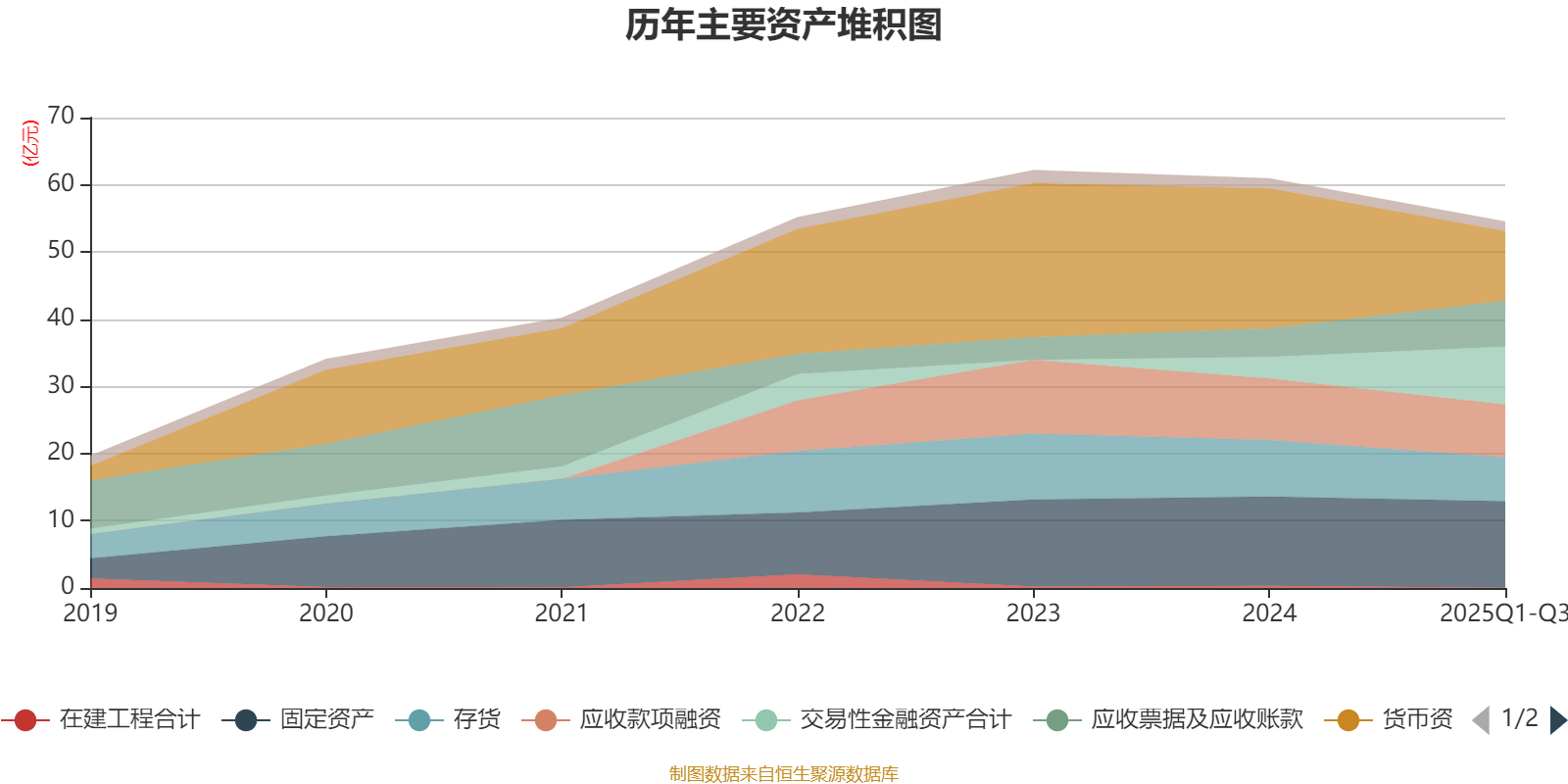 资产重大变化方面,截至2025年三季度末,公司货币资金较上年末减少50.17%,占公司总资产比重下降15.15个百分点;交易性金融资产合计较上年末增加168.81%,占公司总资产比重上升10.52个百分点;应收票据及应收账款较上年末增加60.9%,占公司总资产比重上升5.57个百分点;存货较上年末减少22.24%,占公司总资产比重下降1.81个百分点。