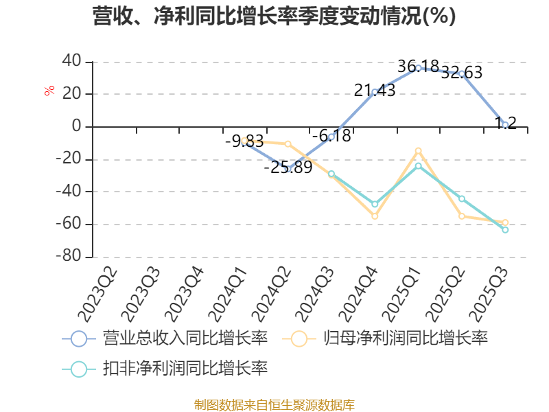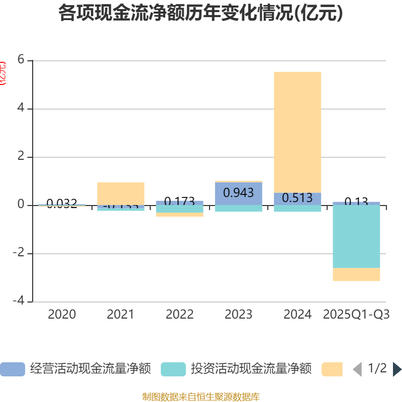 2025年前三季度,公司经营活动现金流净额为1295.8万元,同比下降81.81%;筹资活动现金流净额-5388.05万元,同比减少4919.24万元;投资活动现金流净额-2.61亿元,上年同期为-2482.13万元。