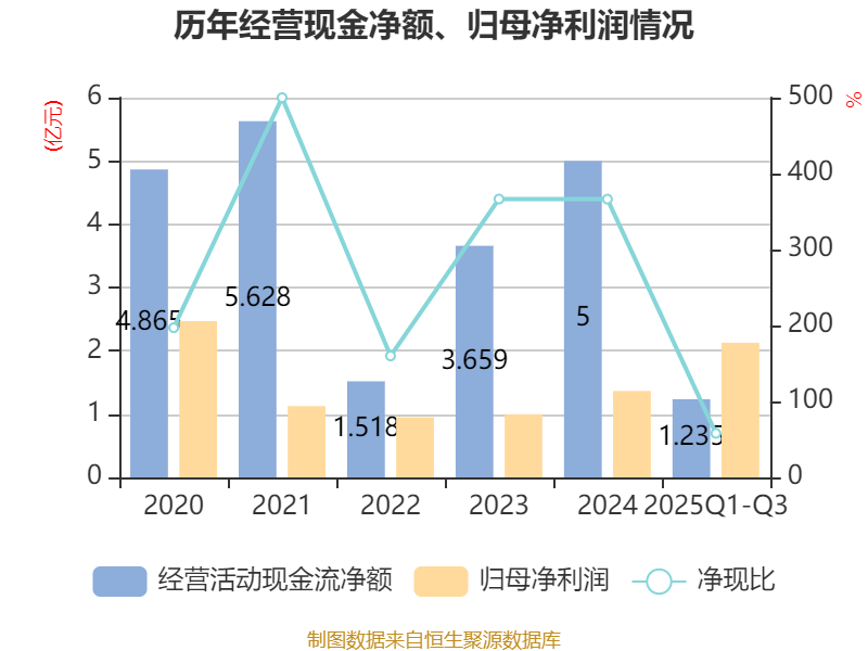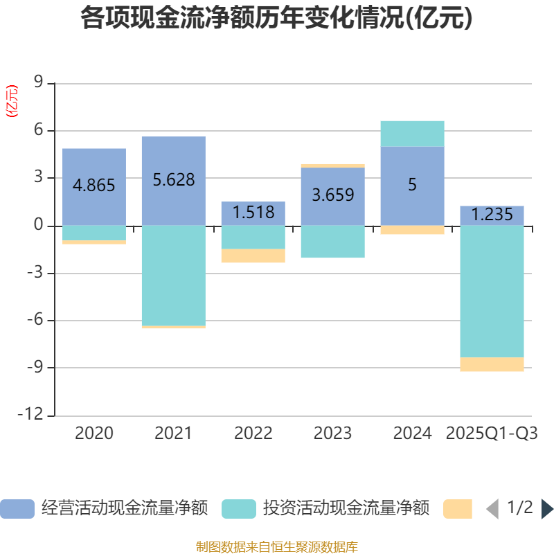 2025年前三季度,公司经营活动现金流净额为1.24亿元,同比增长257.51%;筹资活动现金流净额-8848.44万元,同比减少4935.52万元;投资活动现金流净额-8.33亿元,上年同期为-2.06亿元。
