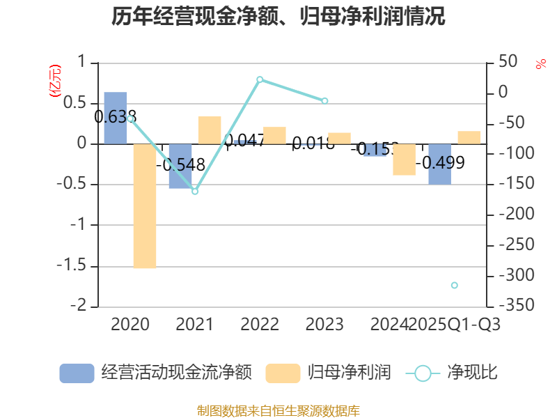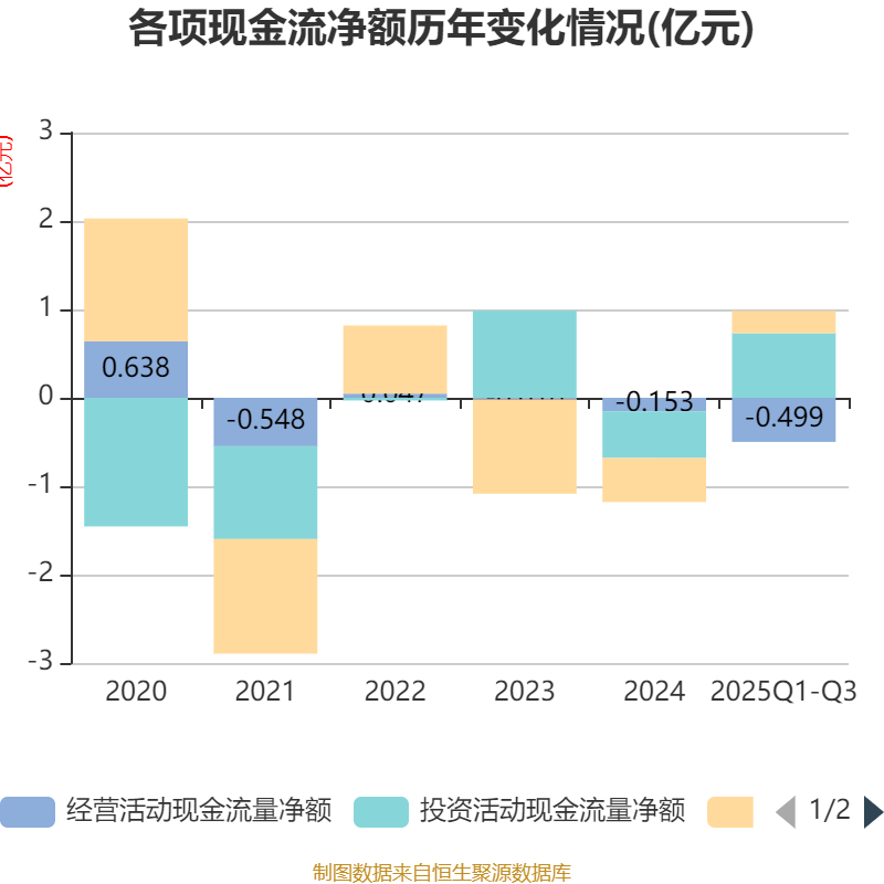 2025年前三季度,公司经营活动现金流净额为-4991.74万元,同比增加2134.94万元;筹资活动现金流净额2512.11万元,同比增加7611.48万元;投资活动现金流净额7304.4万元,上年同期为-5355.31万元。