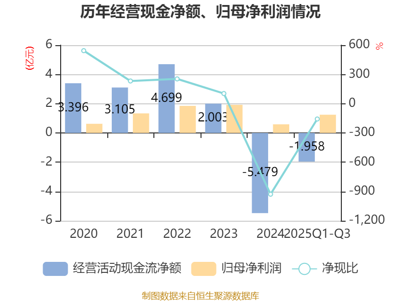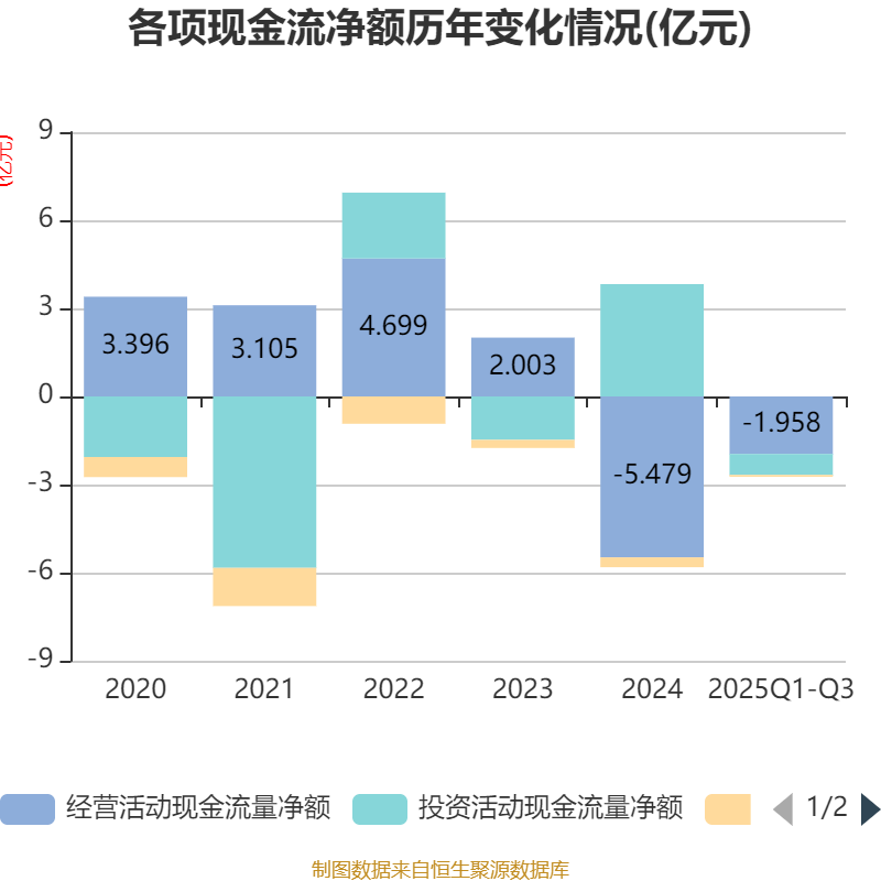 2025年前三季度,公司经营活动现金流净额为-1.96亿元,同比增加9.02亿元;筹资活动现金流净额-621.09万元,同比增加6419.15万元;投资活动现金流净额-7150.25万元,上年同期为2.41亿元。