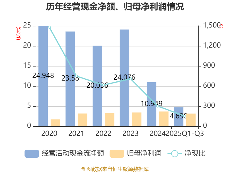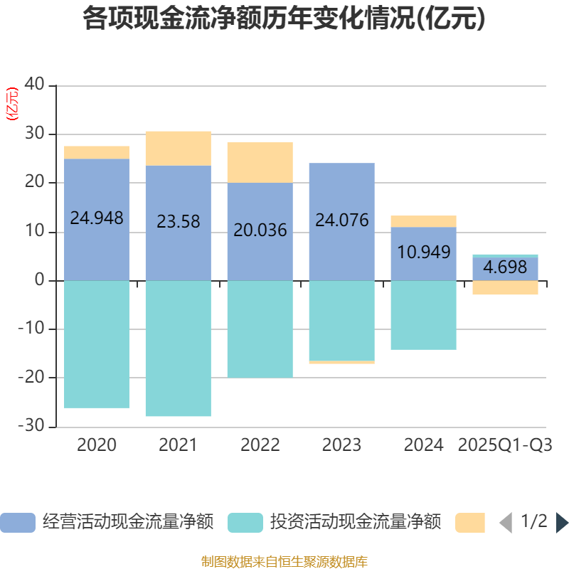 2025年前三季度,公司经营活动现金流净额为4.7亿元,同比增加5.22亿元;筹资活动现金流净额-2.89亿元,同比减少9.89亿元;投资活动现金流净额6113.93万元,上年同期为-2.29亿元。