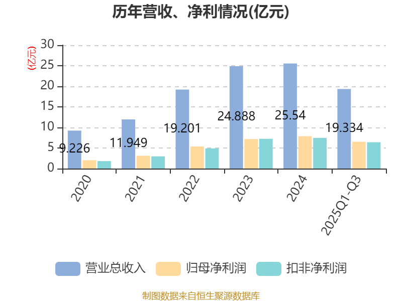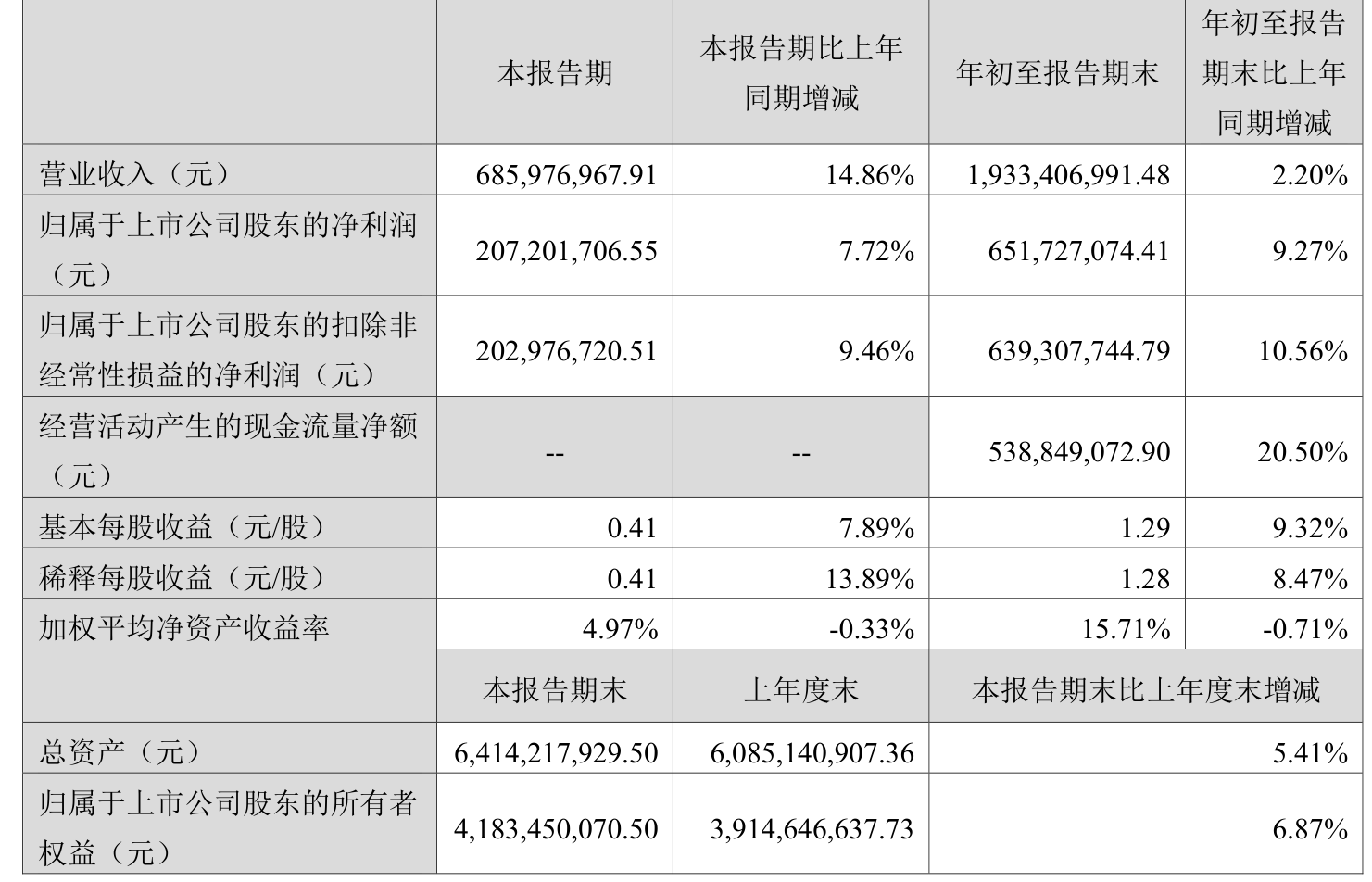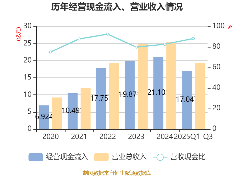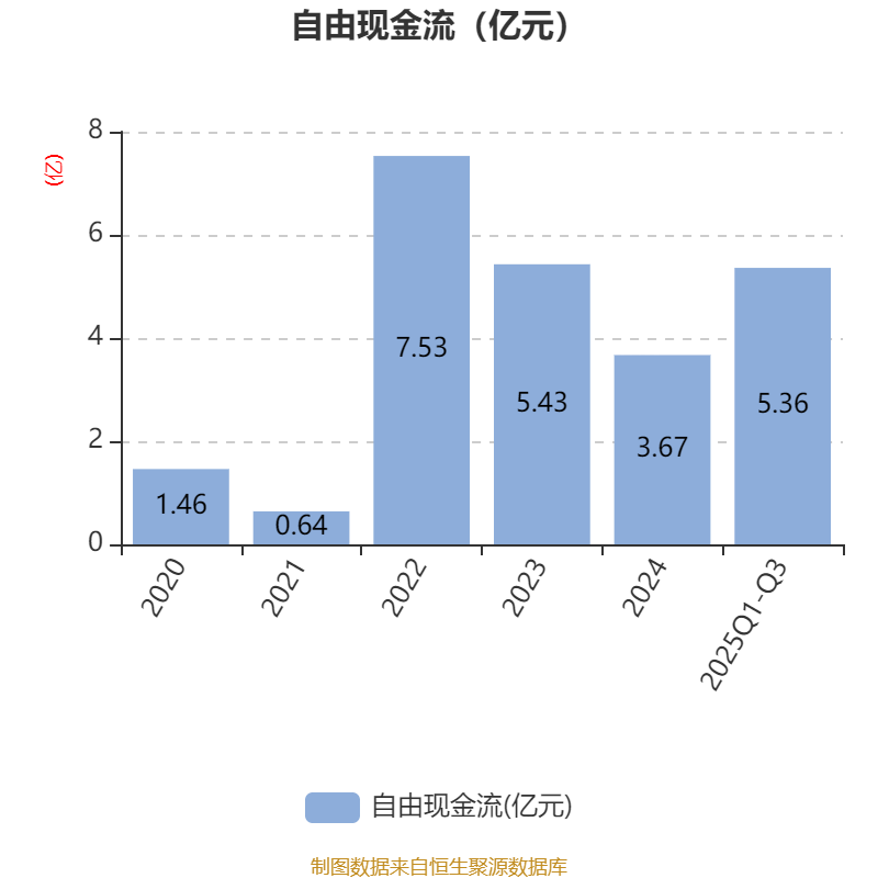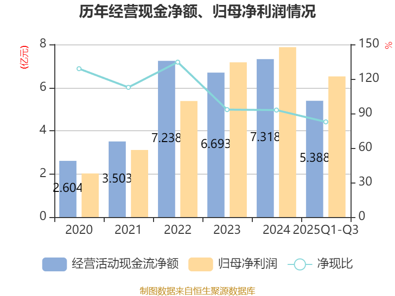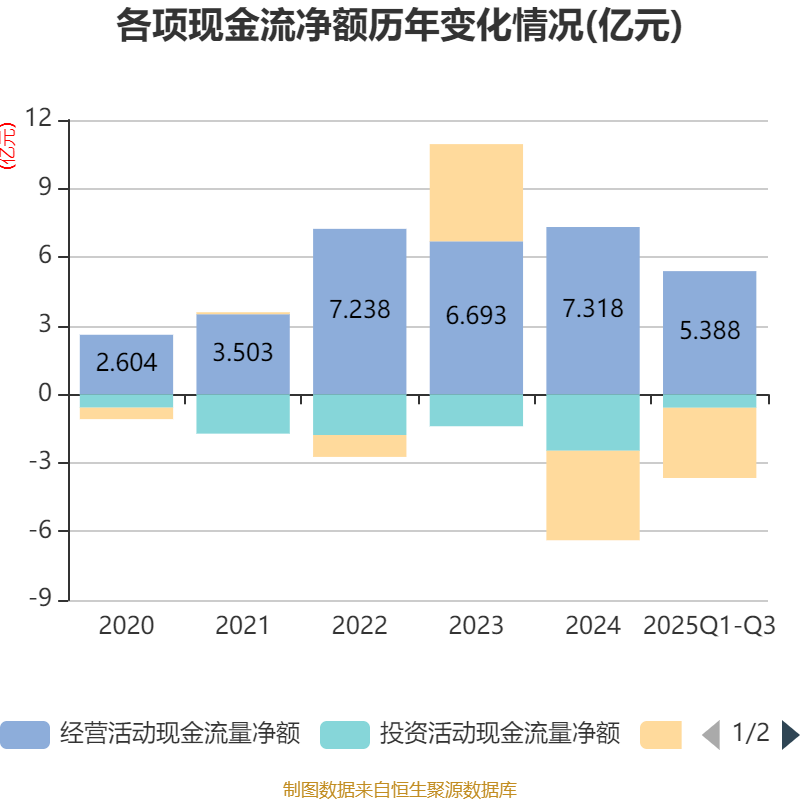 2025年前三季度,公司经营活动现金流净额为5.39亿元,同比增长20.5%;筹资活动现金流净额-3.07亿元,同比增加2903.78万元;投资活动现金流净额-5901.53万元,上年同期为-4.48亿元。