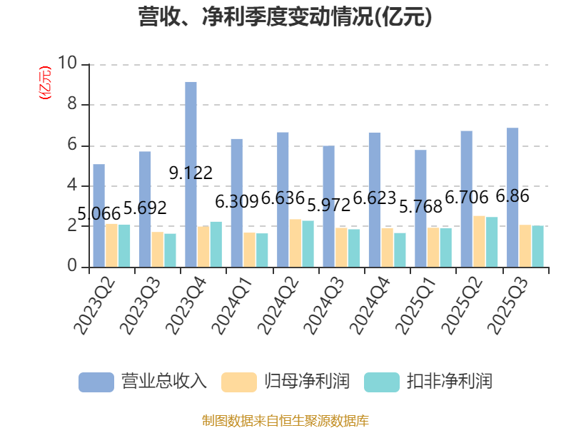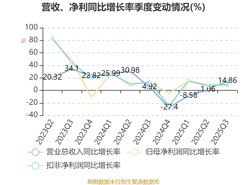 资产重大变化方面,截至2025年三季度末,公司其他流动资产较上年末减少93.63%,占公司总资产比重下降1.32个百分点;交易性金融资产合计较上年末增加86.44%,占公司总资产比重上升1.15个百分点;货币资金较上年末增加7.74%,占公司总资产比重上升0.82个百分点;应收票据及应收账款较上年末增加1.59%,占公司总资产比重下降0.45个百分点。
