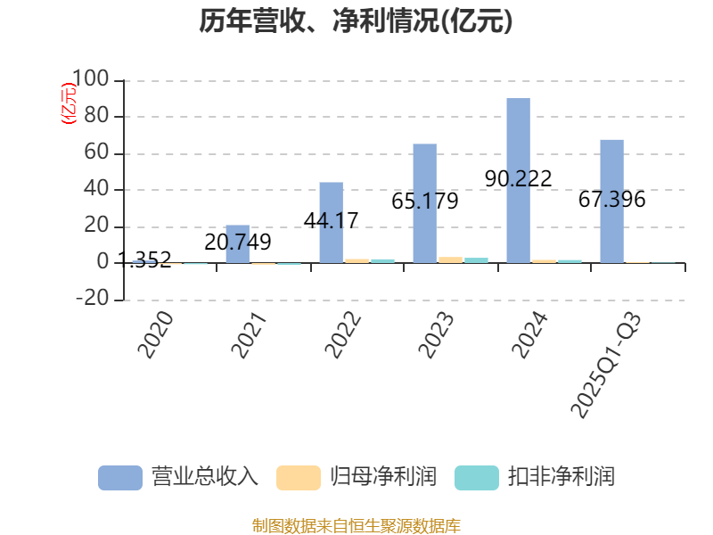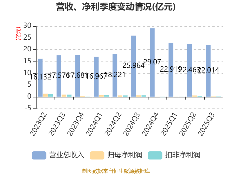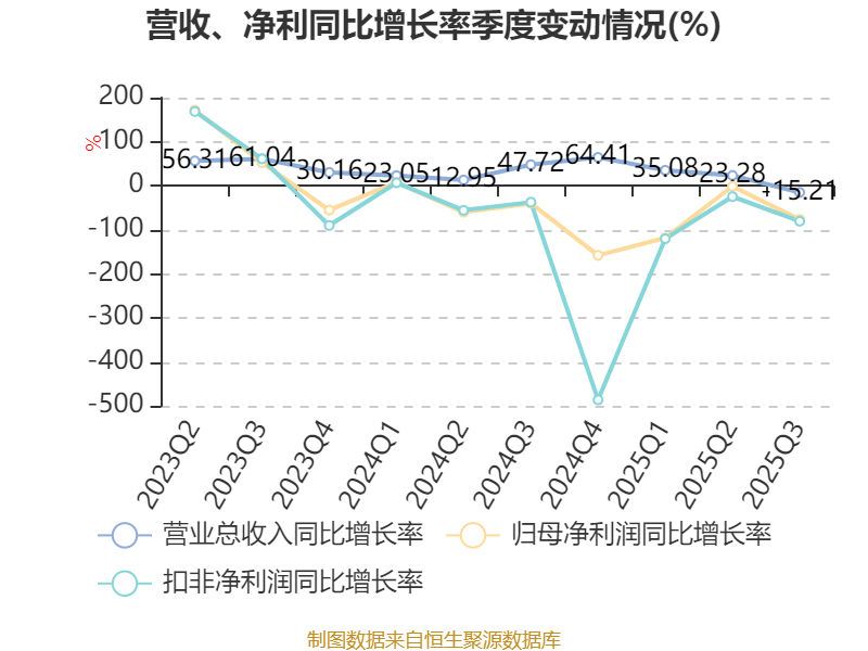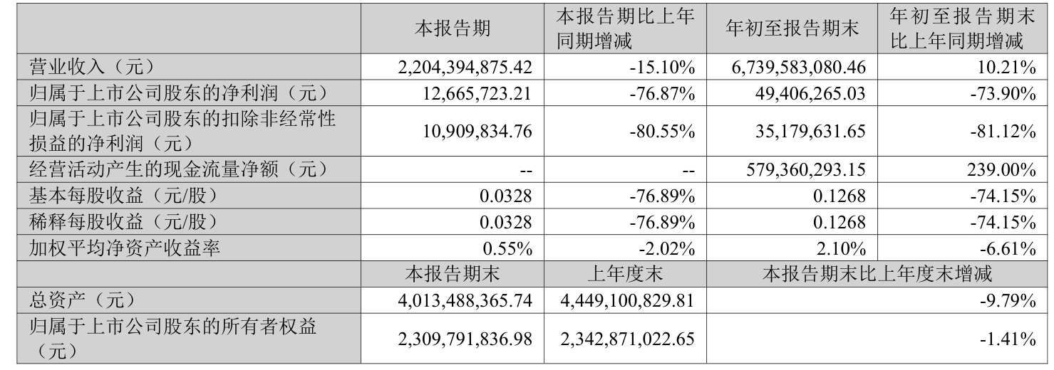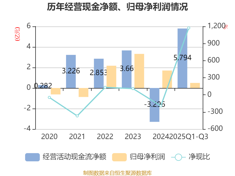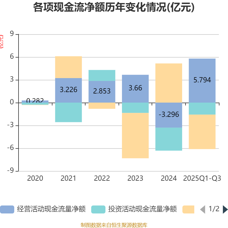 2025年前三季度,公司经营活动现金流净额为5.79亿元,同比增加9.96亿元;筹资活动现金流净额-4.54亿元,同比减少8.7亿元;投资活动现金流净额-1.58亿元,上年同期为-6.75亿元。