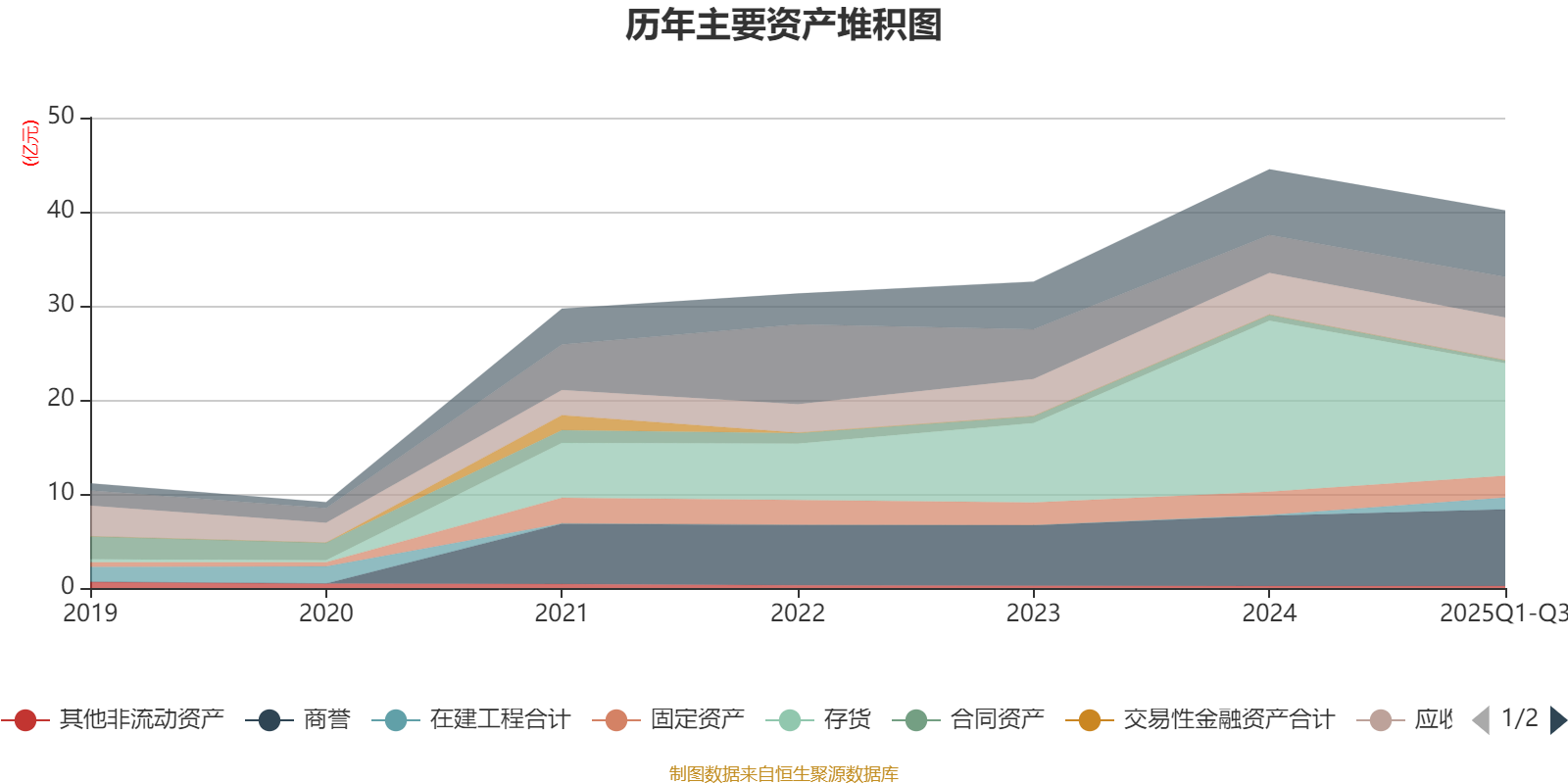 资产重大变化方面,截至2025年三季度末,公司存货较上年末减少34.22%,占公司总资产比重下降11.07个百分点;商誉较上年末增加8.94%,占公司总资产比重上升3.49个百分点;在建工程合计较上年末增加1247.27%,占公司总资产比重上升2.91个百分点;货币资金较上年末增加7.4%,占公司总资产比重上升1.73个百分点。