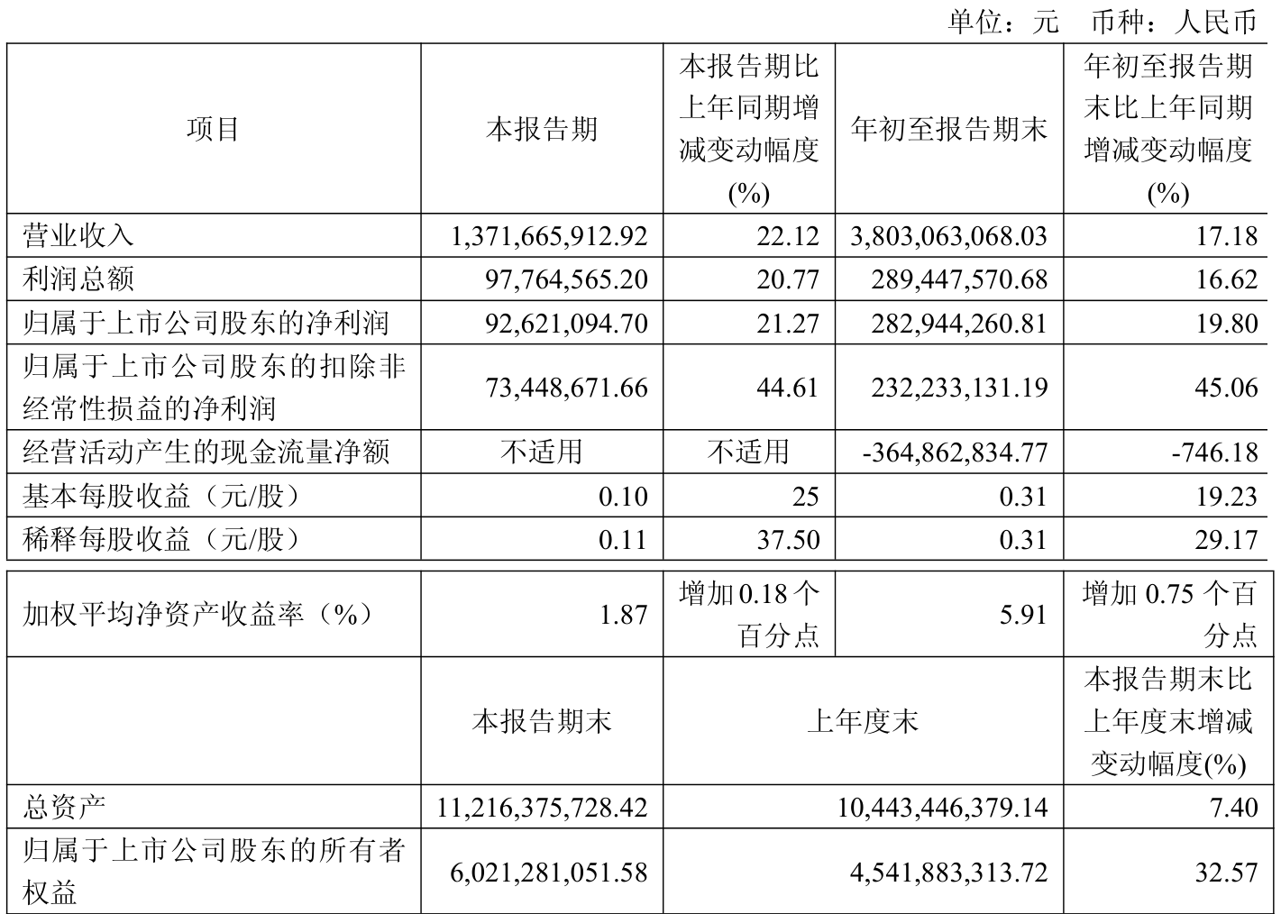 中证智能财讯东材科技(601208)10月24日披露2025年第三季度报告。前三季度公司实现营业总收入38.03亿元,同比增长17.18%;归母净利润2.83亿元,同比增长19.80%;扣非净利润2.32亿元,同比增长45.06%;经营活动产生的现金流量净额为-3.65亿元,上年同期为-4311.9万元;报告期内,东材科技基本每股收益为0.31元,加权平均净资产收益率为5.91%。