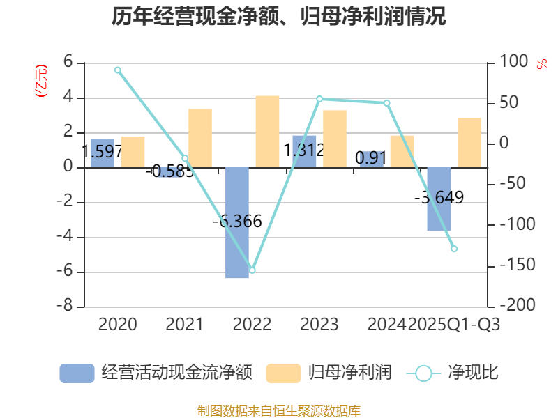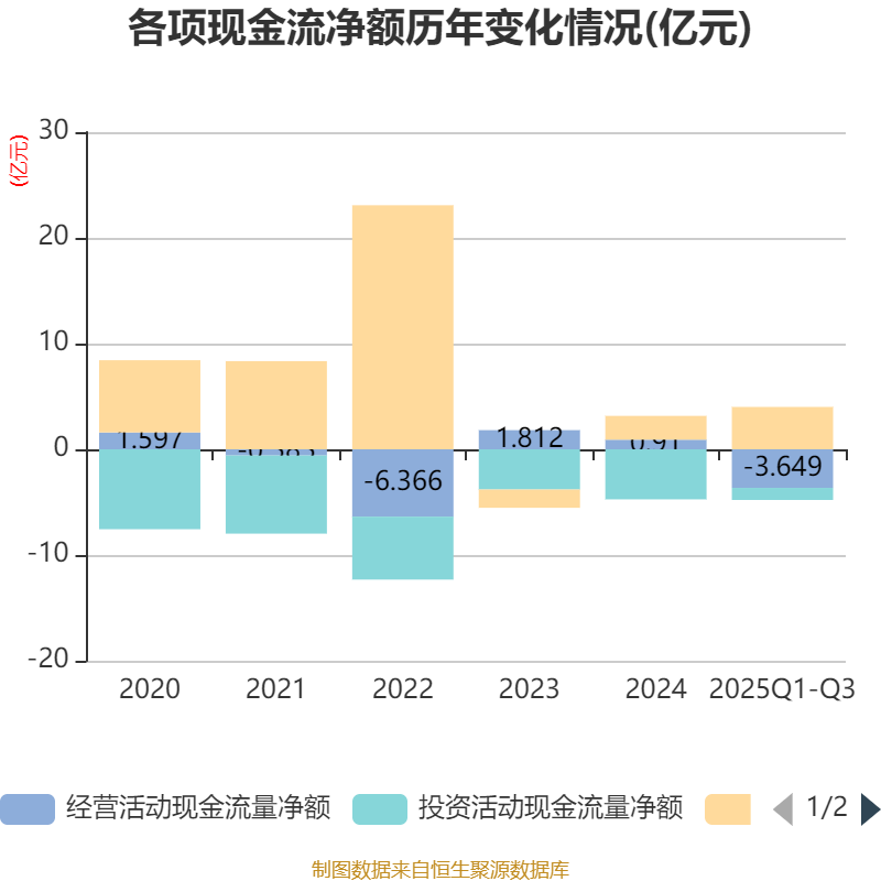 2025年前三季度,公司经营活动现金流净额为-3.65亿元,同比减少3.22亿元;筹资活动现金流净额4.01亿元,同比减少8334.79万元;投资活动现金流净额-1.14亿元,上年同期为-6.16亿元。