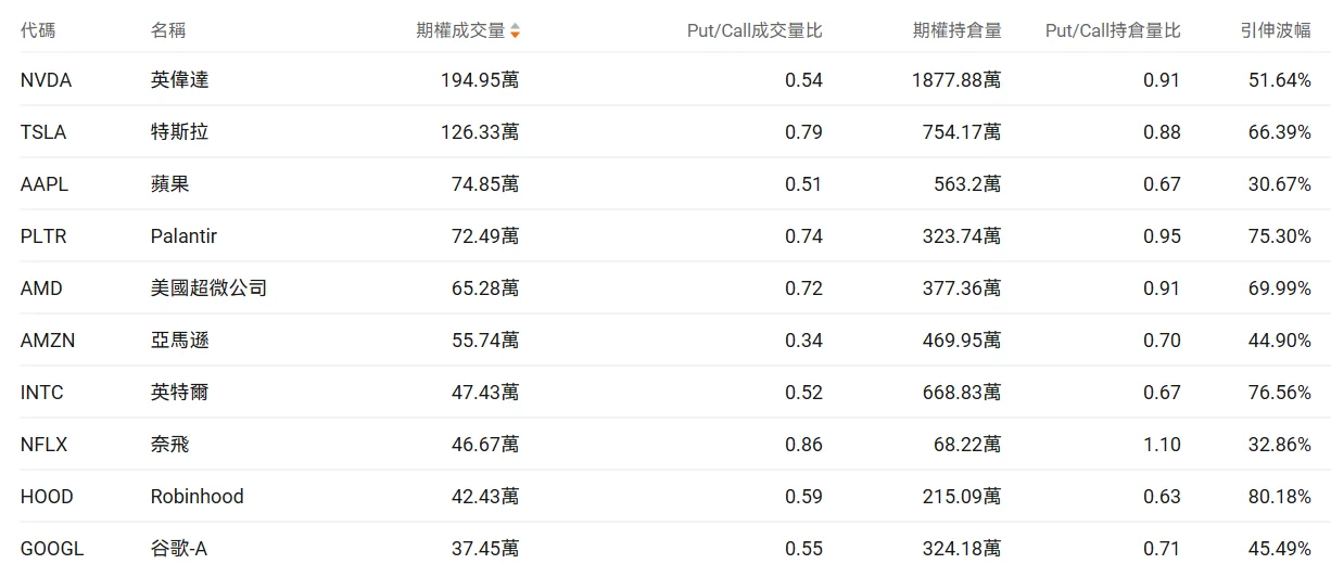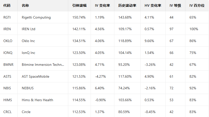 美股引申波动幅度排行榜前十(标的市值>100亿美元,且期权成交量>10万美元)