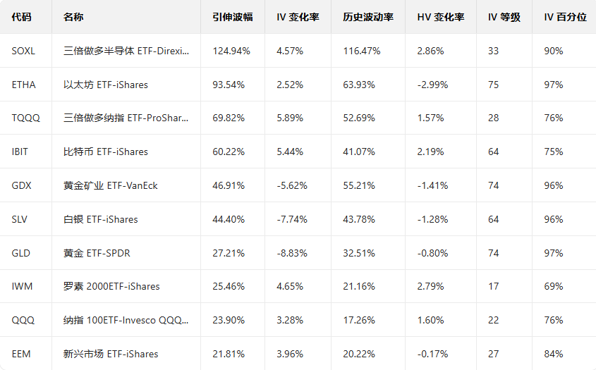 美股ETF引申波幅排行榜前十(标的要求:市值>100亿美元)